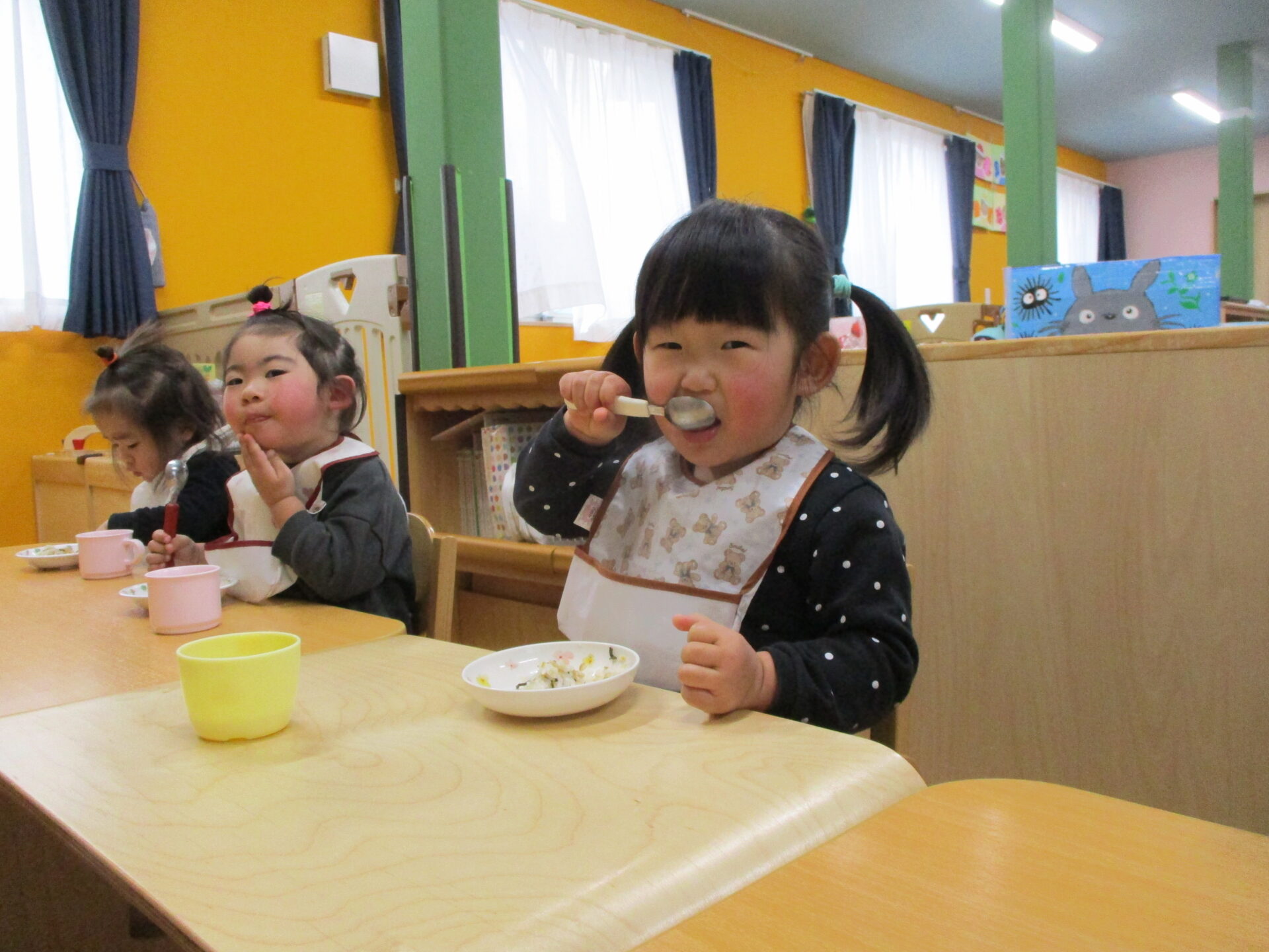 「おいしいね♡」の保育者の声に、にっこり笑顔でこたえてくれました(⌒∇⌒)💓