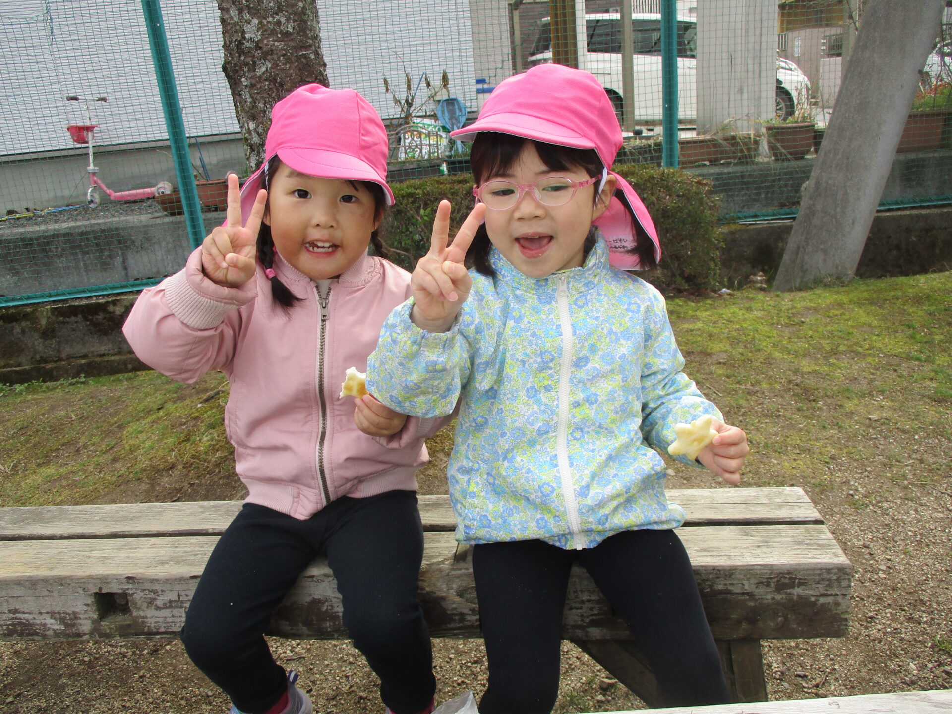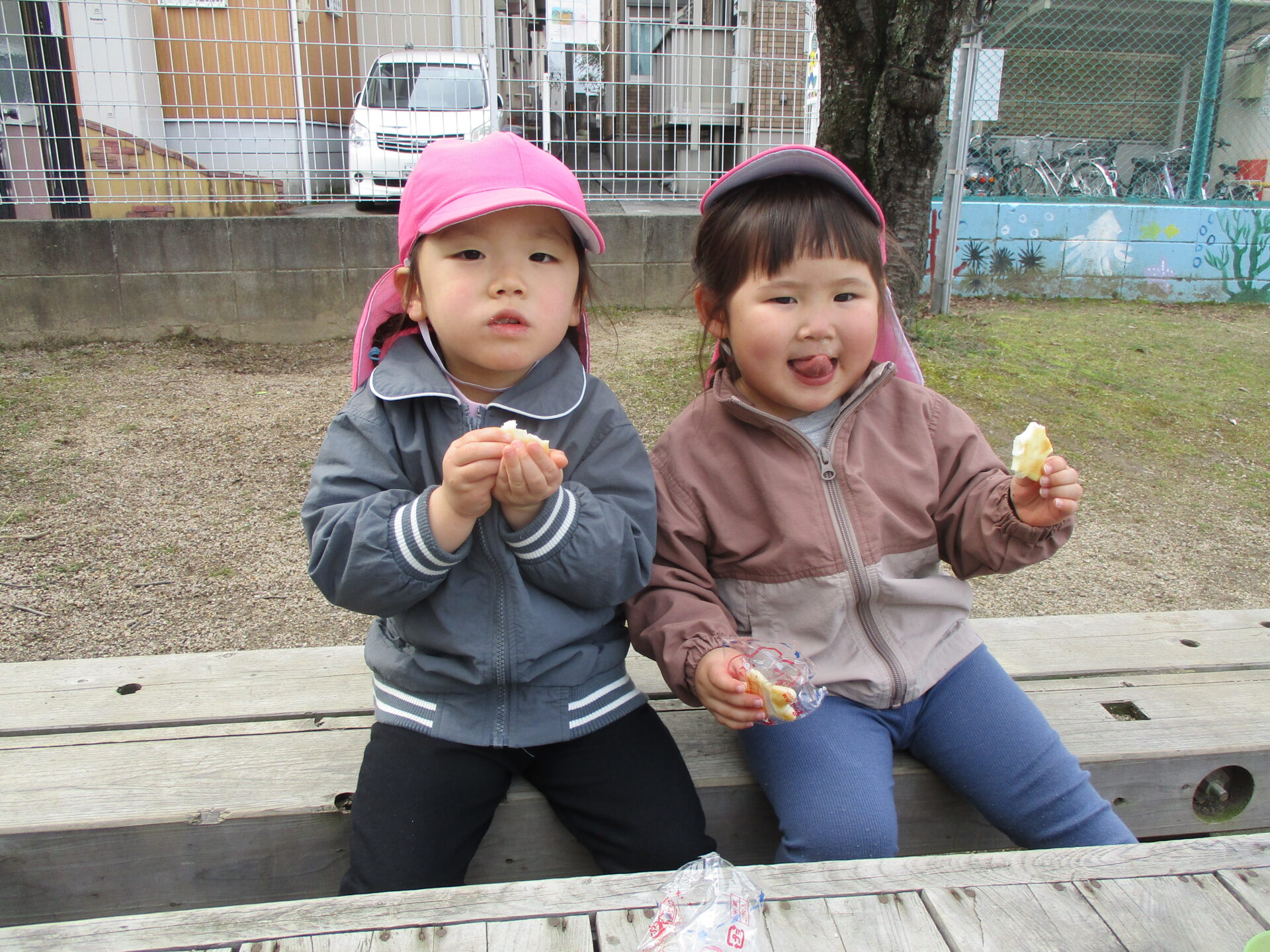 ベンチを見つけ、「○○ちゃん一緒に食べよう!」と、誘い合っていました🥰