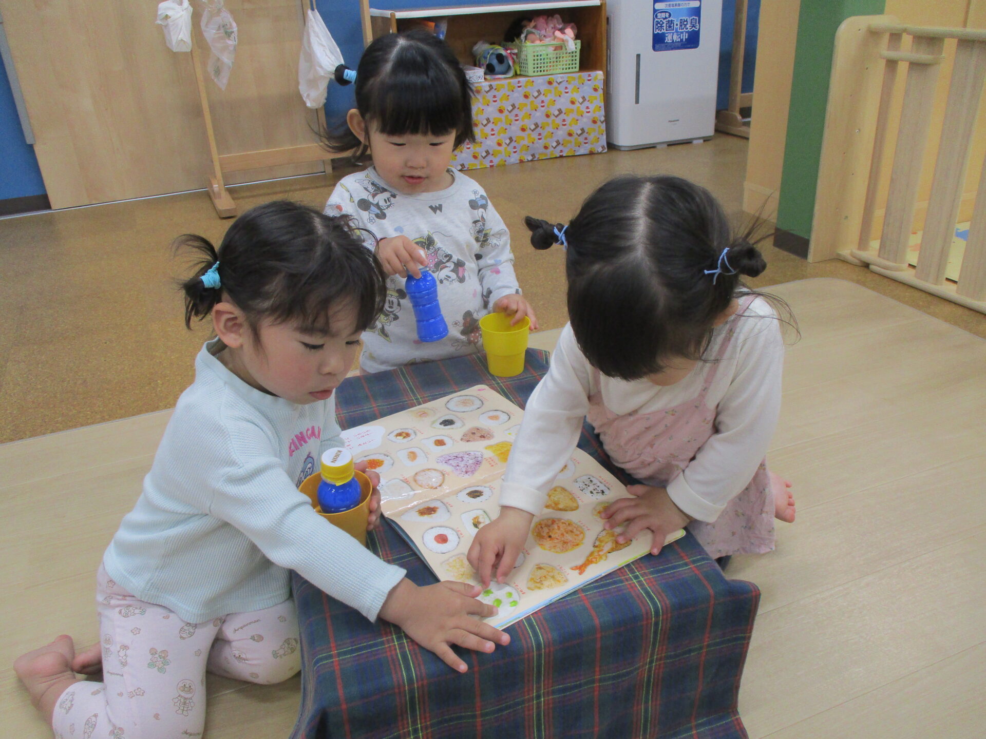こちらはおいしそうなおにぎり🍙がたくさん載った絵本に夢中の三人組🥰つまんでは口へ運び、顔を見合わせてニコニコする様子が微笑ましかったです💓