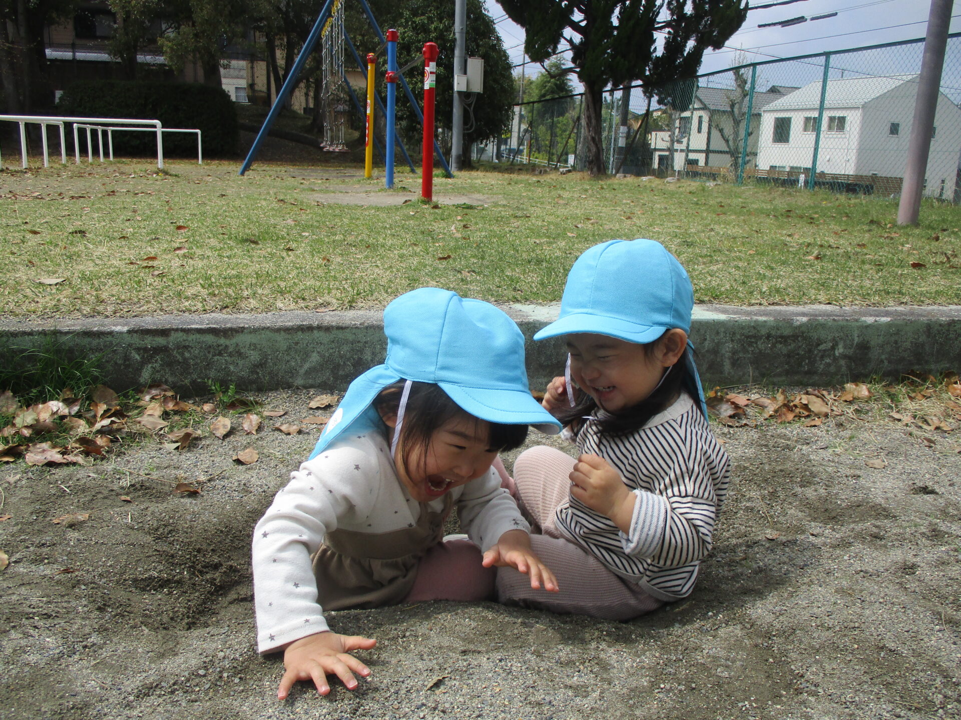 砂場に穴を見つけ、仲良く中に入って楽しそうでした🥰