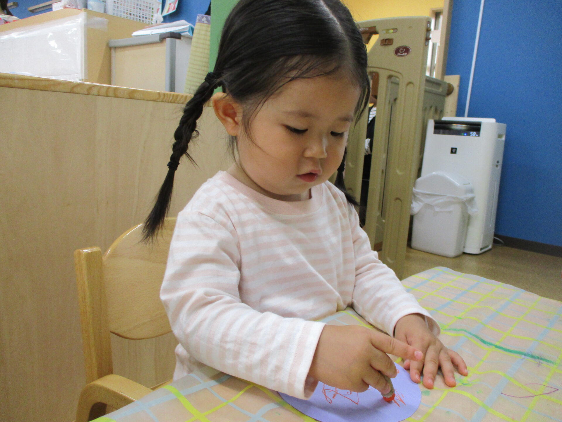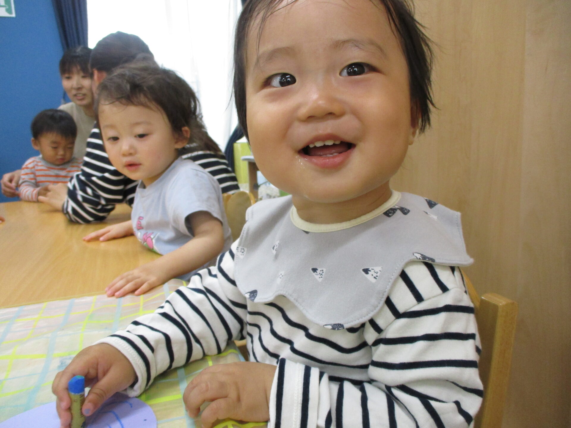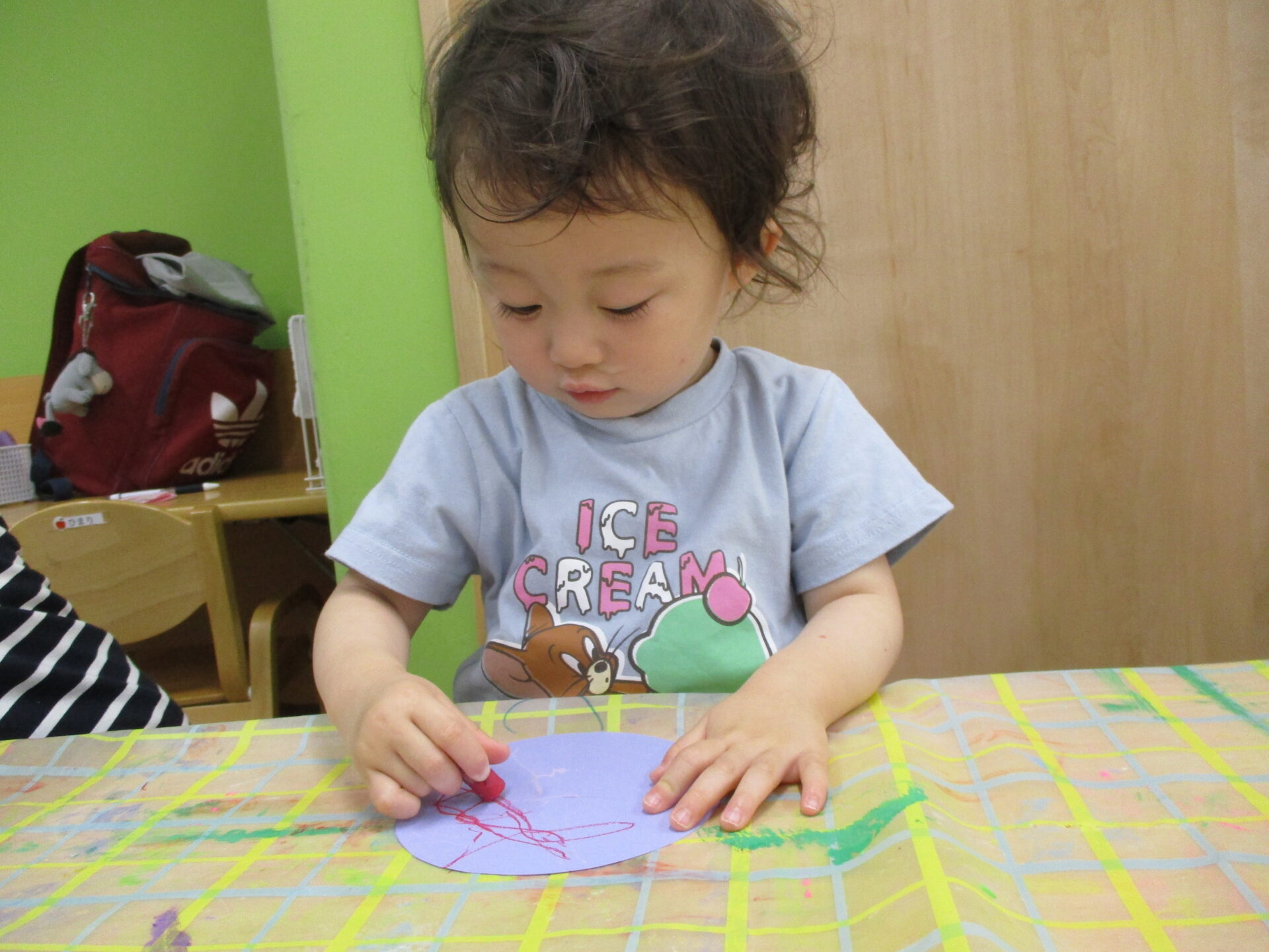 かたつむりの制作をしました!まずはクレパスを使ってお絵描きです(⌒∇⌒)クレパスを見ると”やりたい!!”と手を伸ばして催促する姿もあり、やる気満々でした💓