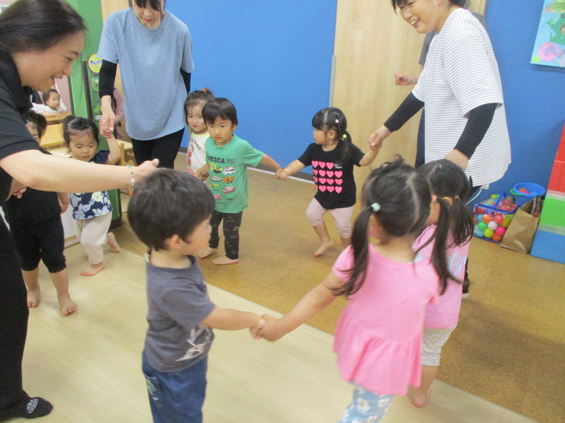 みんなで手を繋いでサークルになり、英語の歌に合わせてグルグル回ったりサークルを大きくしたり小さくしたり・・・(⌒∇⌒)💓