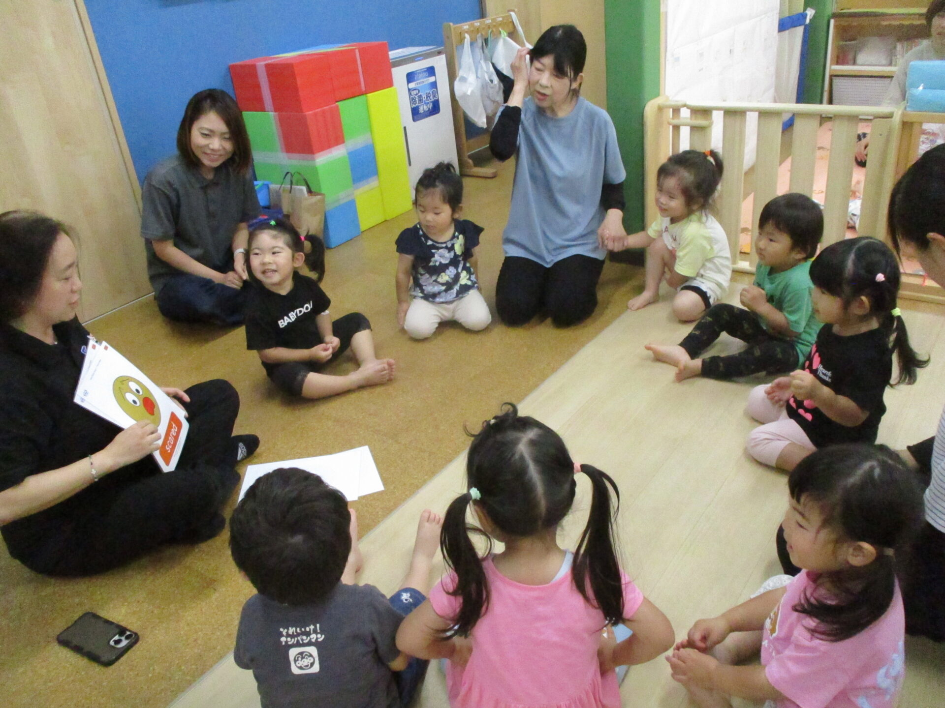 ”Happy” ”angry” “scared”の顔の表情のカードを見ながら、先生の真似をして発音をしてみたり、表情を真似したり・・・Erin先生の表情に釘付けのみんなでした(⌒∇⌒)💓