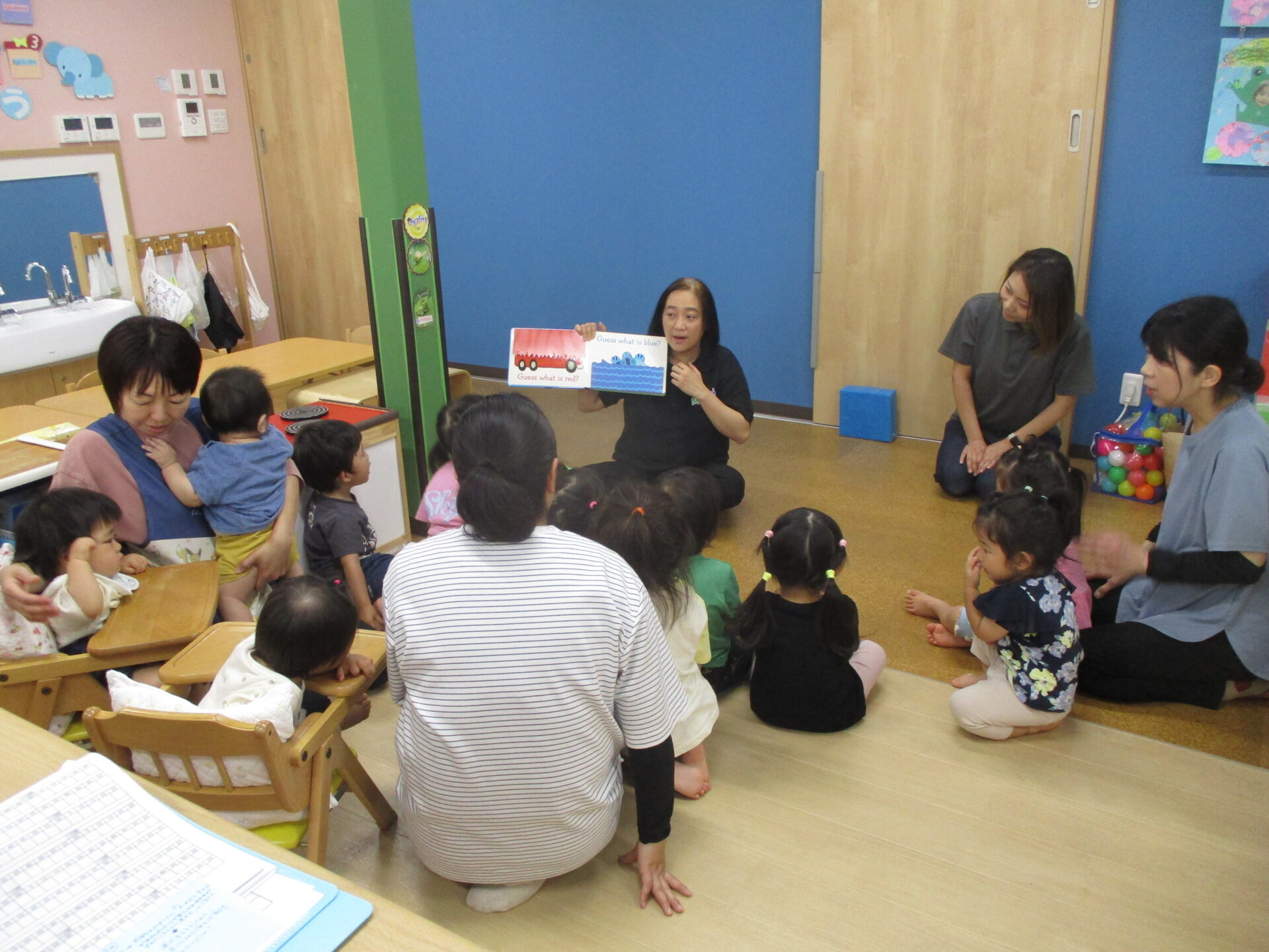 先生「何色でしょう??」 ➡ 子「きいろ!!」 ➡ 先生「YELLOW!!」 ➡ 子 「イエロー!!」のやり取りの繰り返しで、赤・青・黄・紫を教えてもらいました(^▽^)/