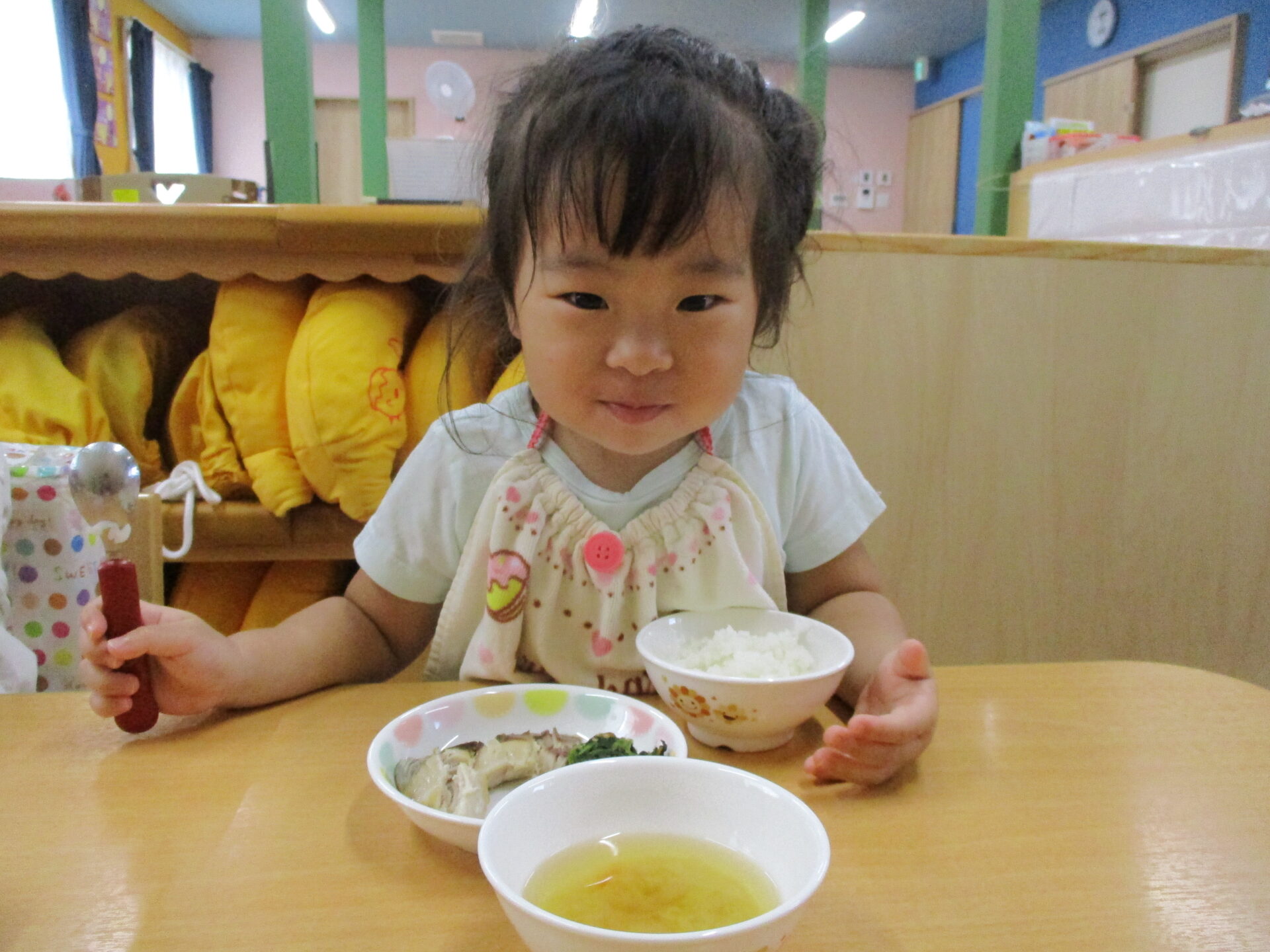 4月当初は、保育者に手伝ってもらう事も多かったのですが、今では”自分で”の気持ちが育まれ、スプーンですくって意欲的に食べられるようになりました(⌒∇⌒)✨まだまだ時間もかかりますし、散らかることもあります・・・でも、毎日の繰り返しの中で、手先を上手く使ってスプーンを扱えるようになったり、自分でできたという達成感が自信へ繋がっていきます✨『食べることは生きること』!!ご家庭と園とで共に、生きる力を育む関わりをしていきましょう!!