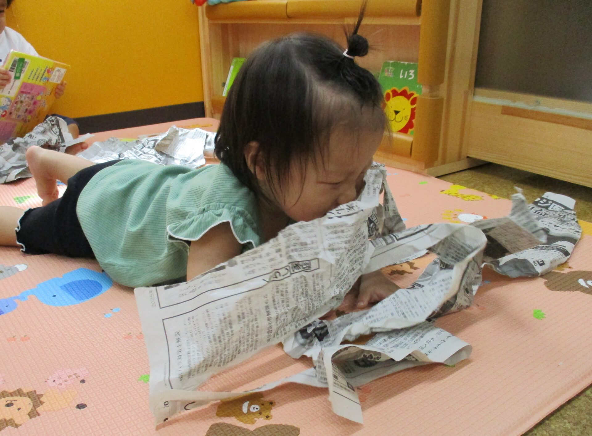 新聞の手触りや破る時の「ビリビリ」という音、インクの匂い…新聞遊びは五感を刺激する遊びです✨