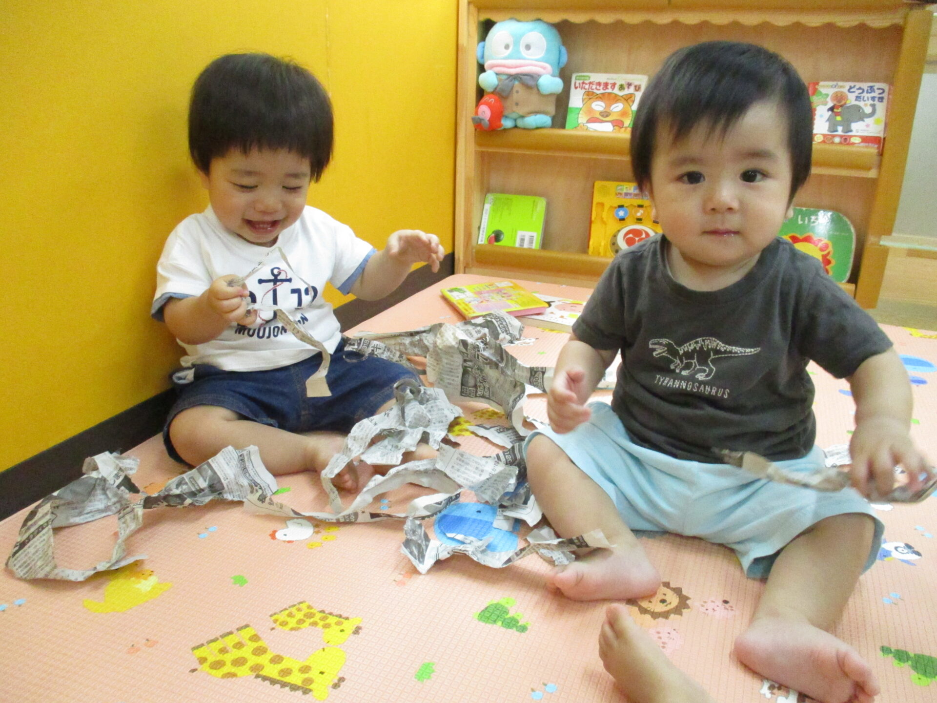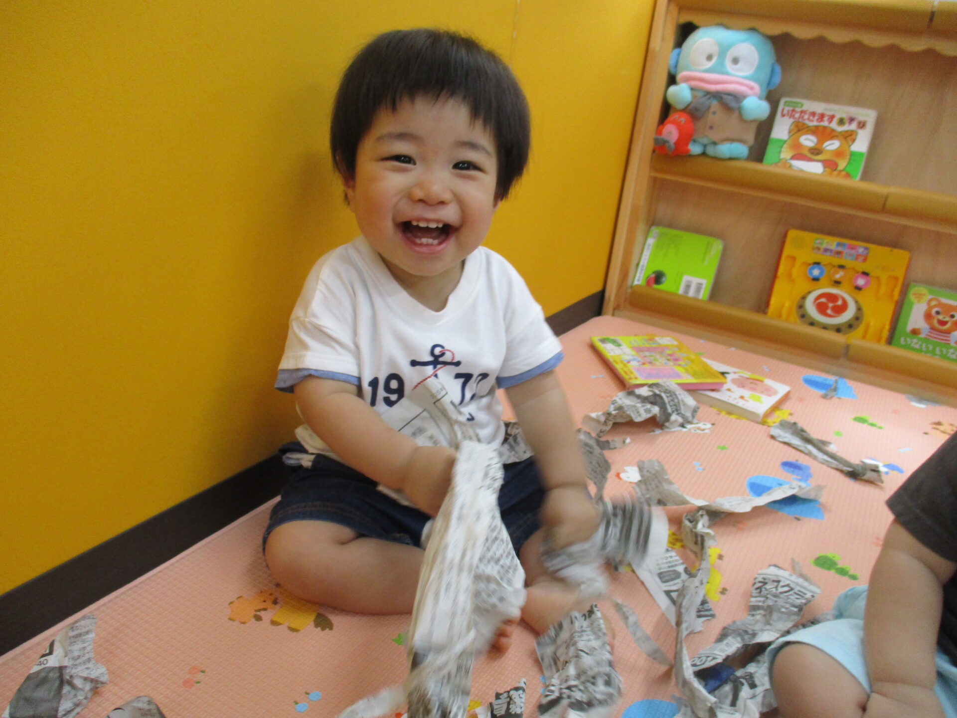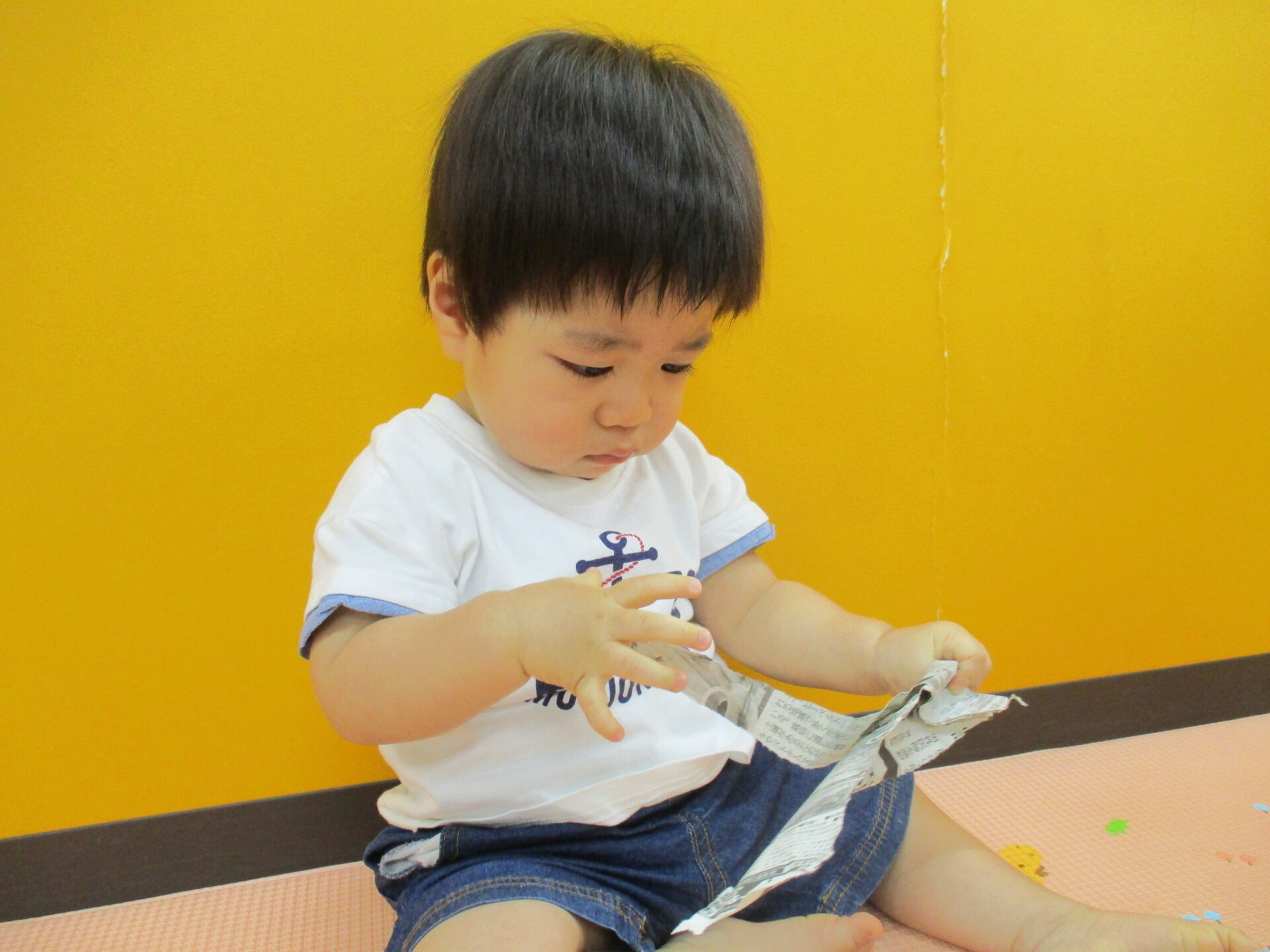 初めての新聞遊び😊(0歳児うみチーム)
