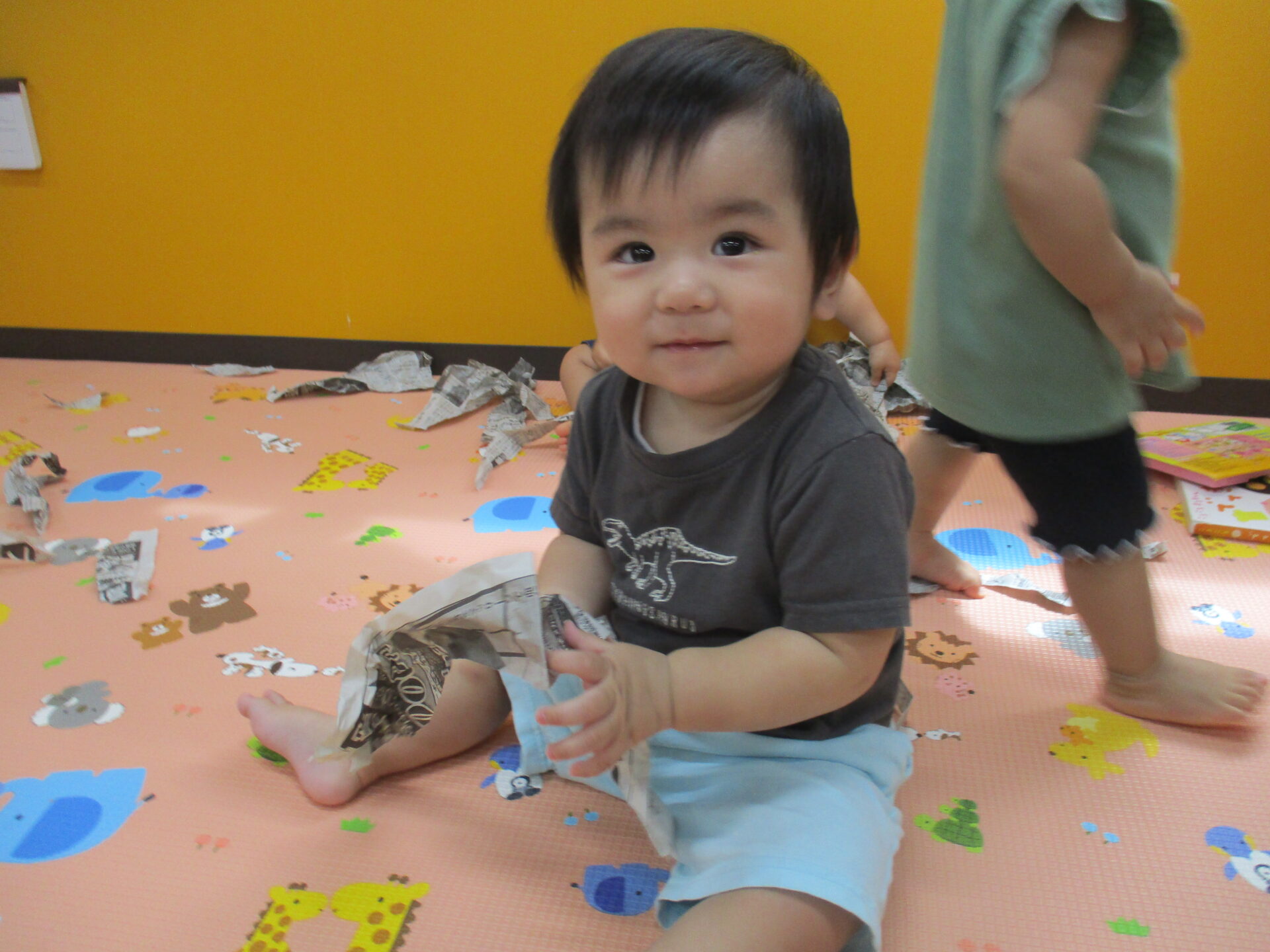 低月齢児の子どもも、友達の遊ぶ様子に興味津々で、積極的に新聞に手を伸ばしていました😊