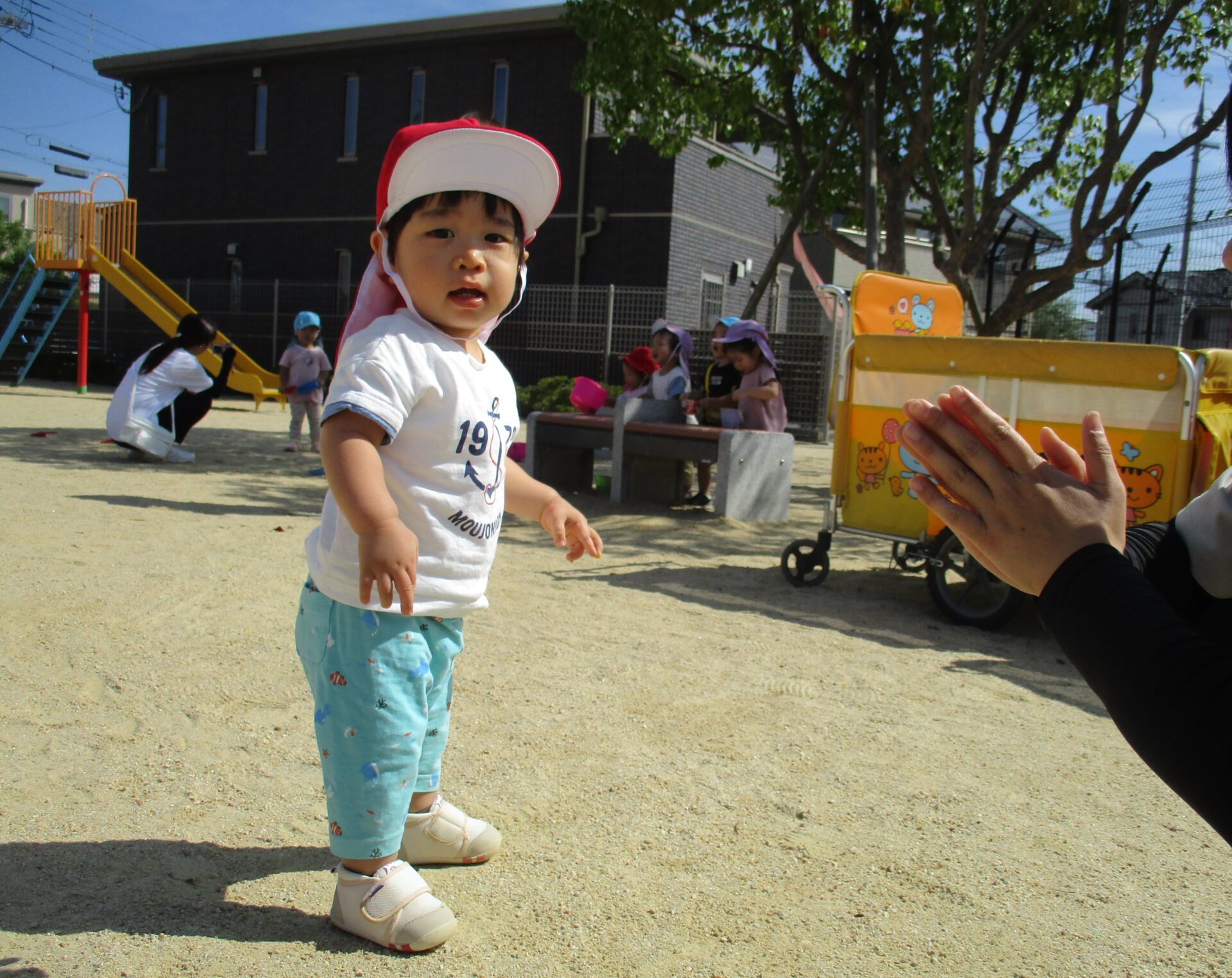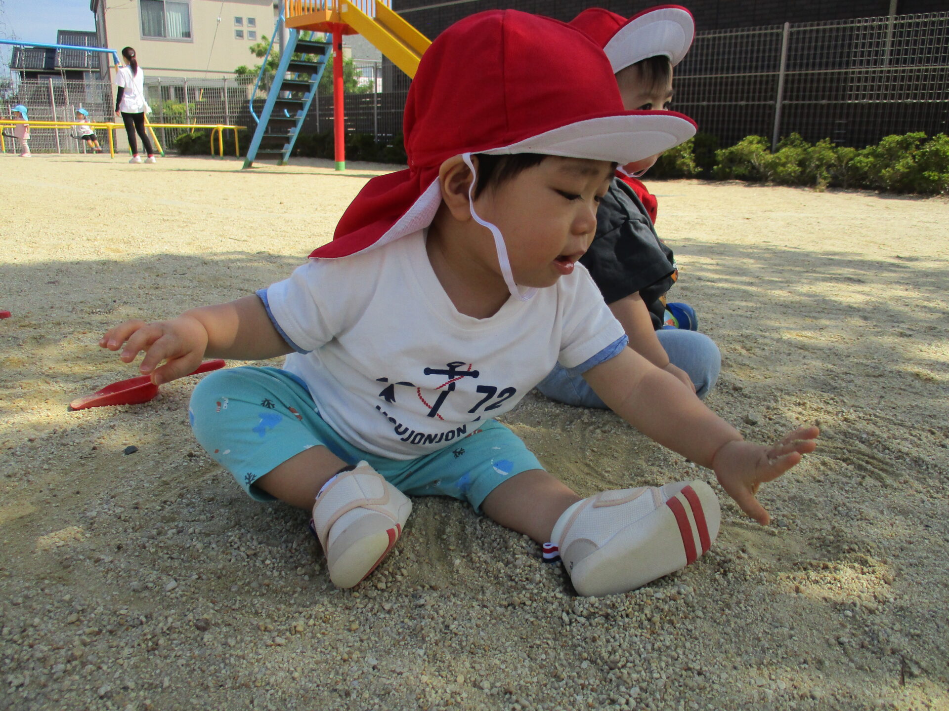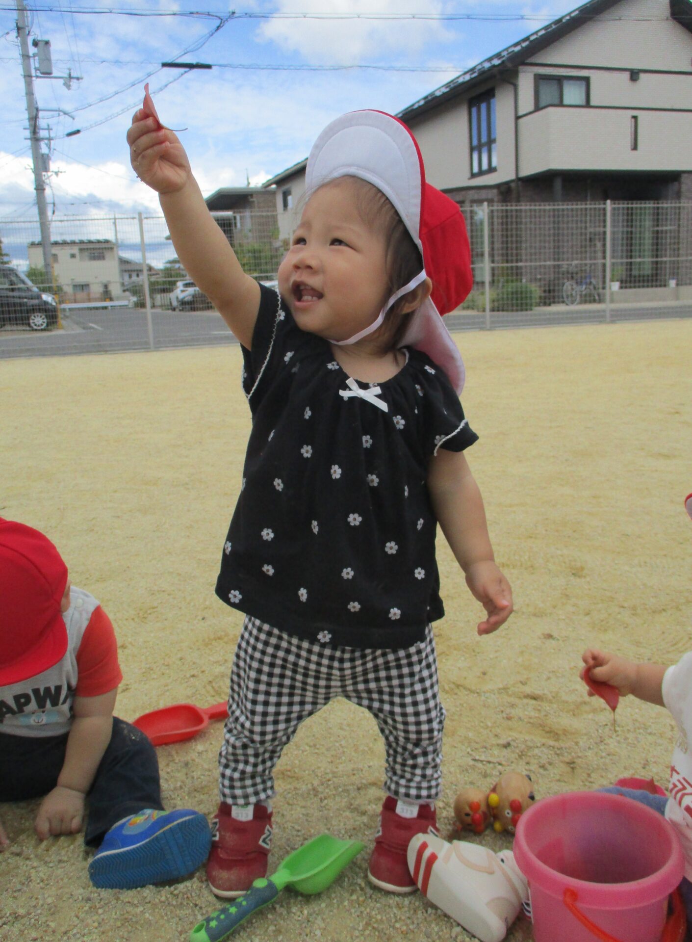 春は大きかった赤い帽子がピッタリになり、戸外で活動的に過ごす姿に成長を感じています🍀