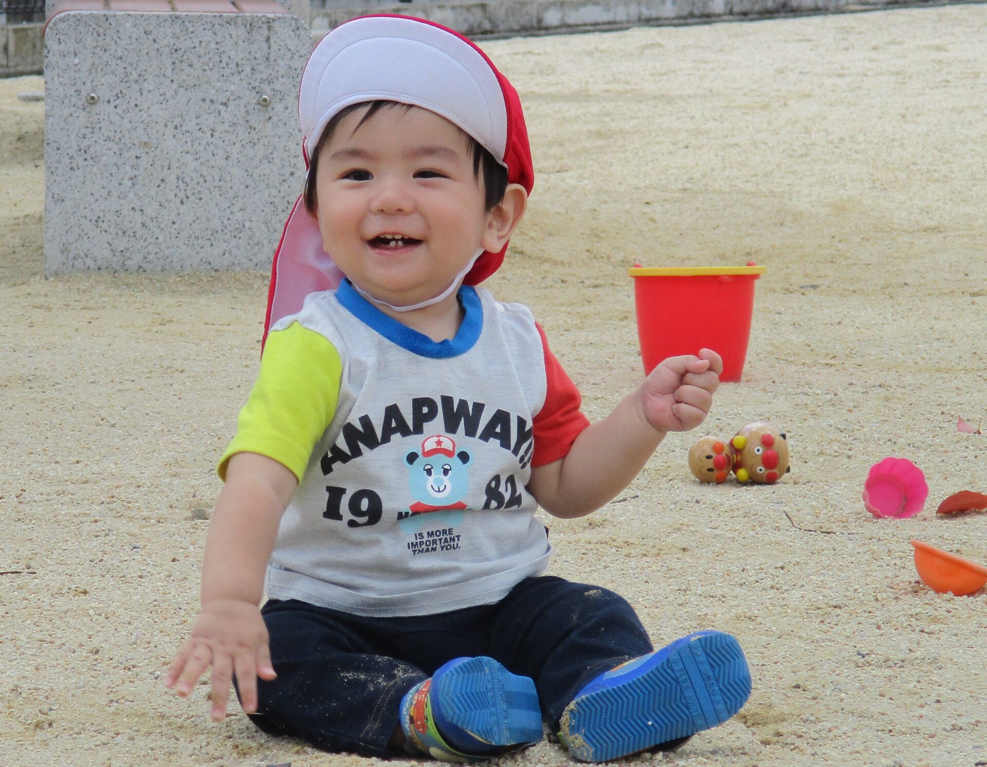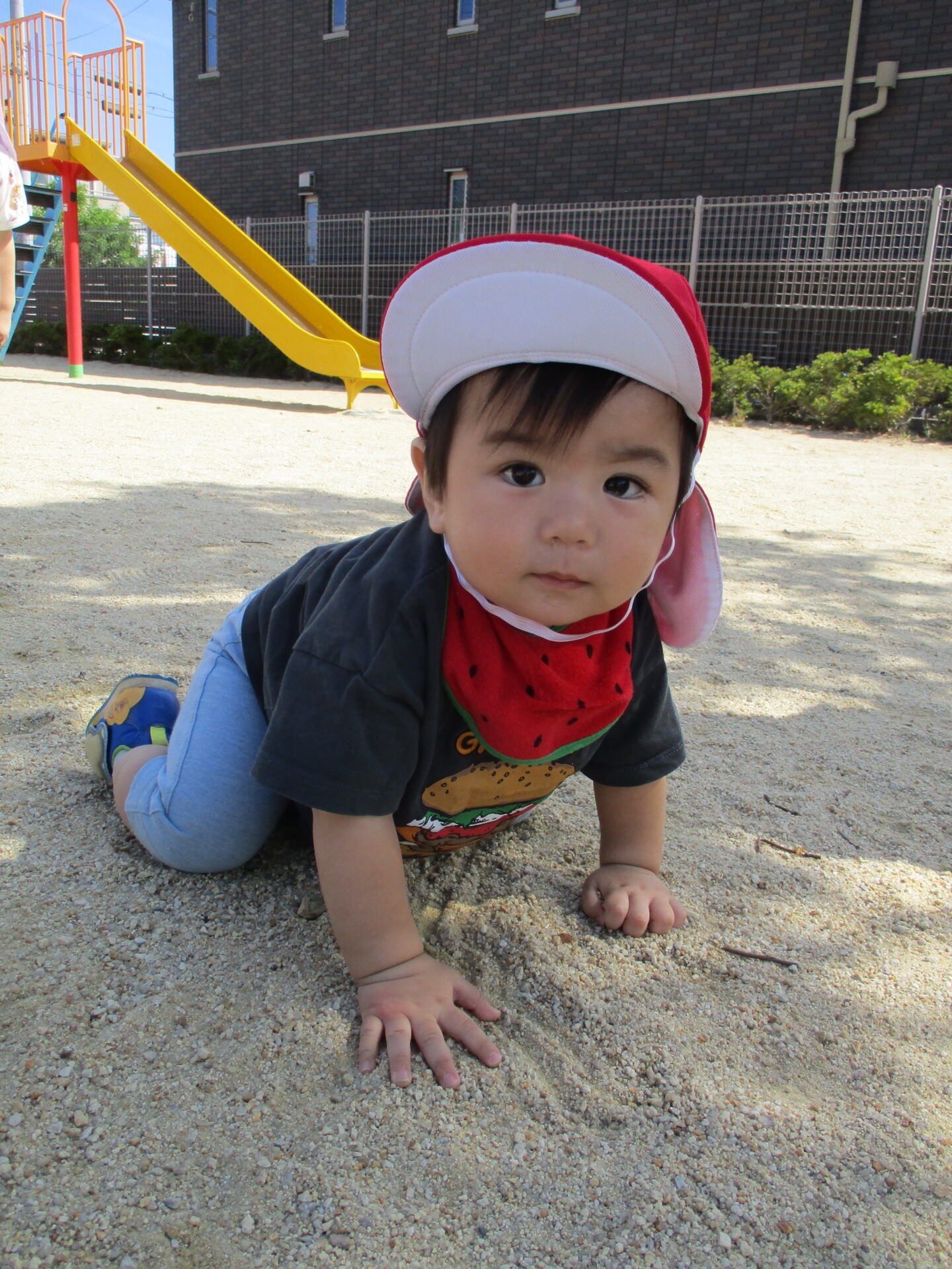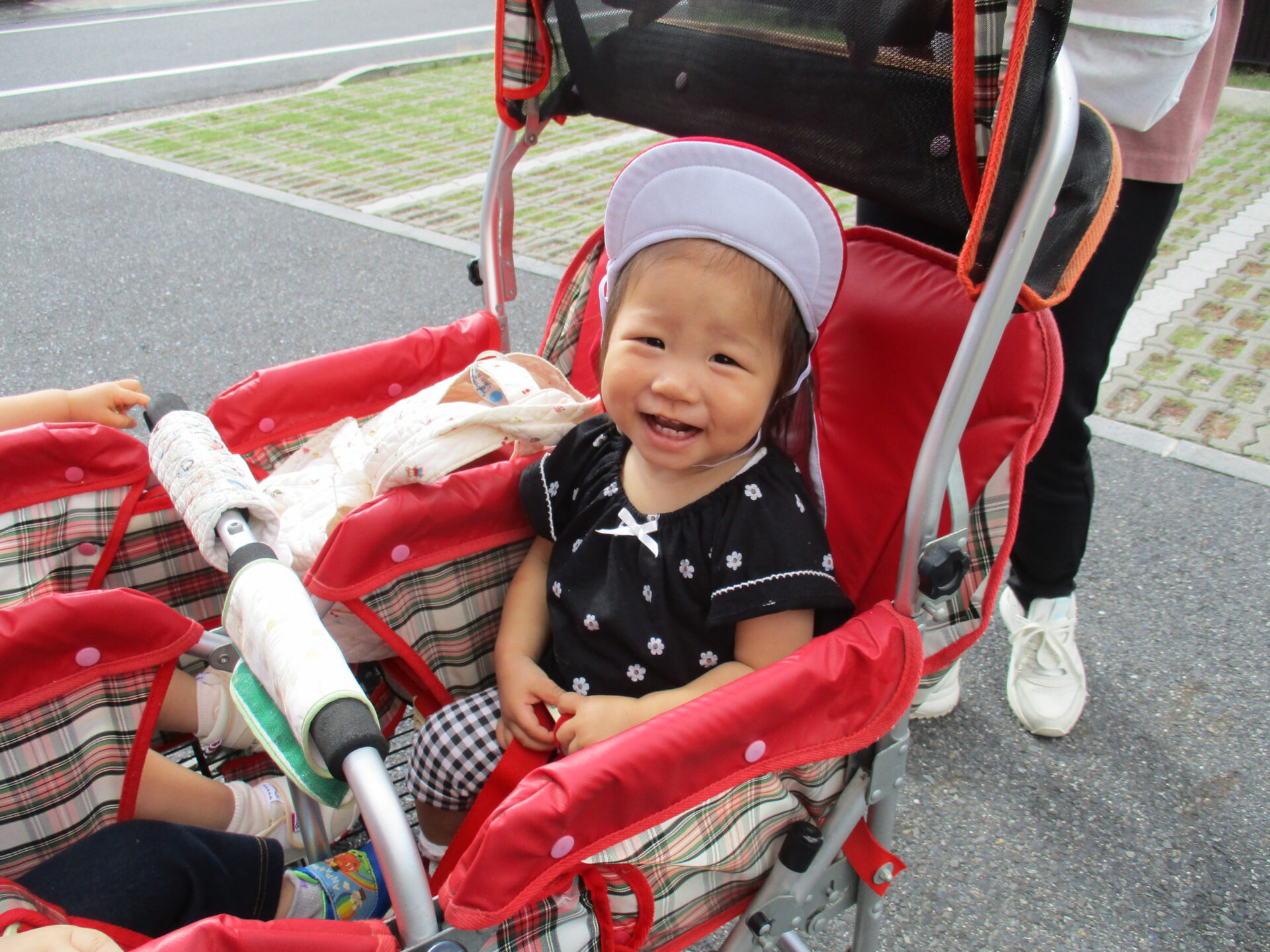春は大きかった赤い帽子がピッタリになり、戸外で活動的に過ごす姿に成長を感じています🍀