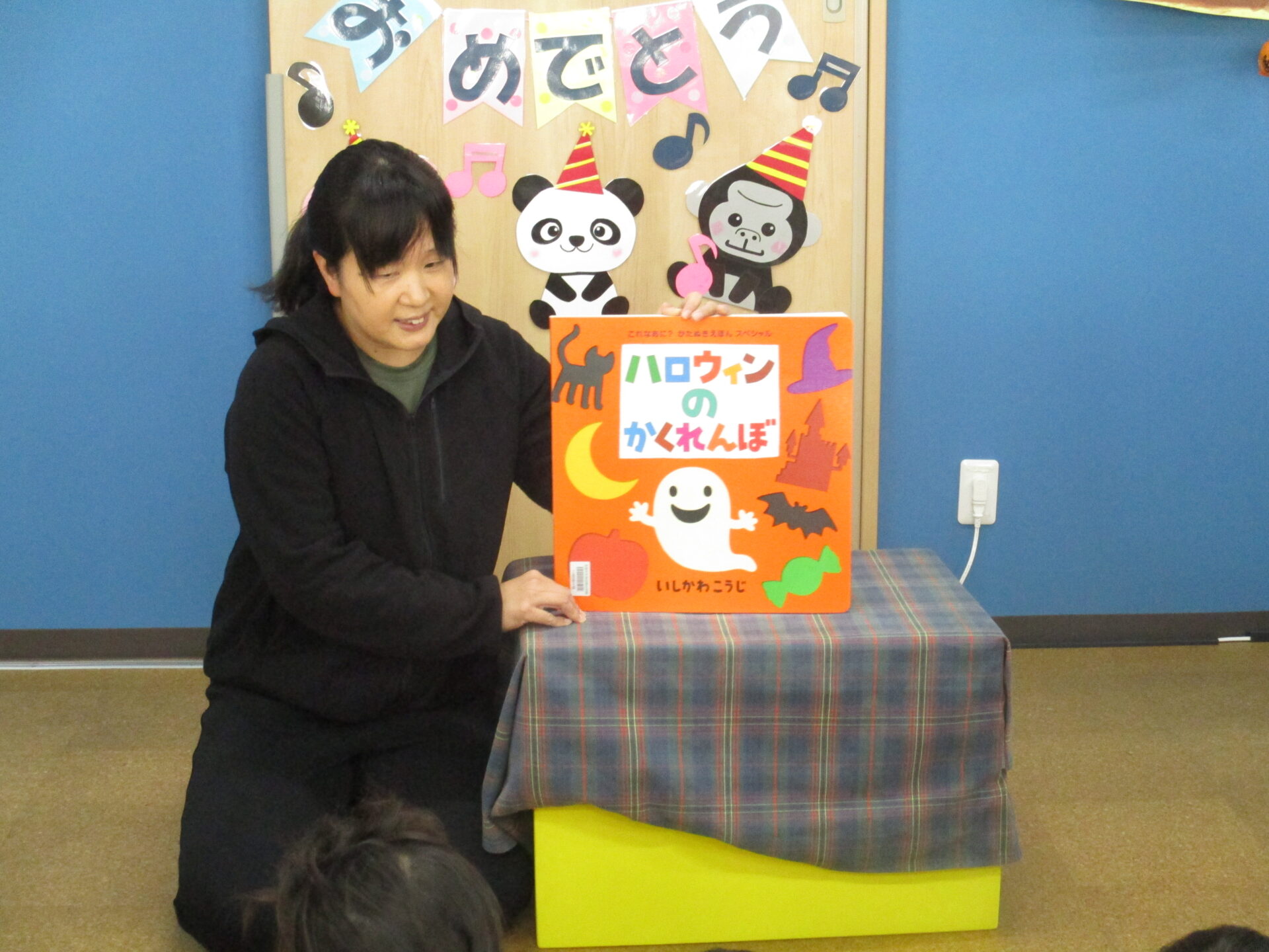担当保育者からの出し物は、「ハロウィンのかくれんぼ」という大型絵本でした(⌒∇⌒)💕
