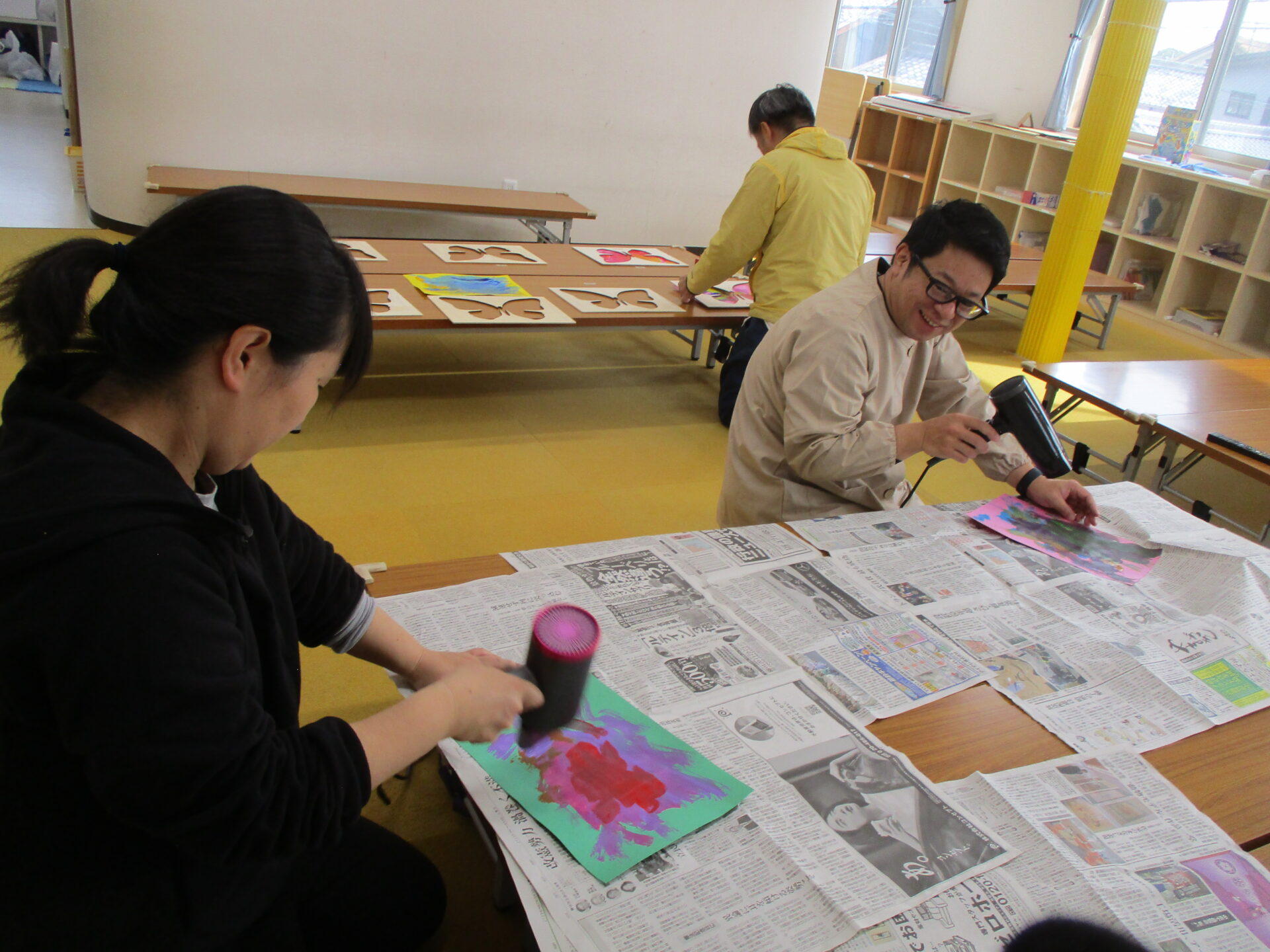 先生達が先ほどの作品をドライヤーで乾かし、枠にはめる作業に追われていました(笑)