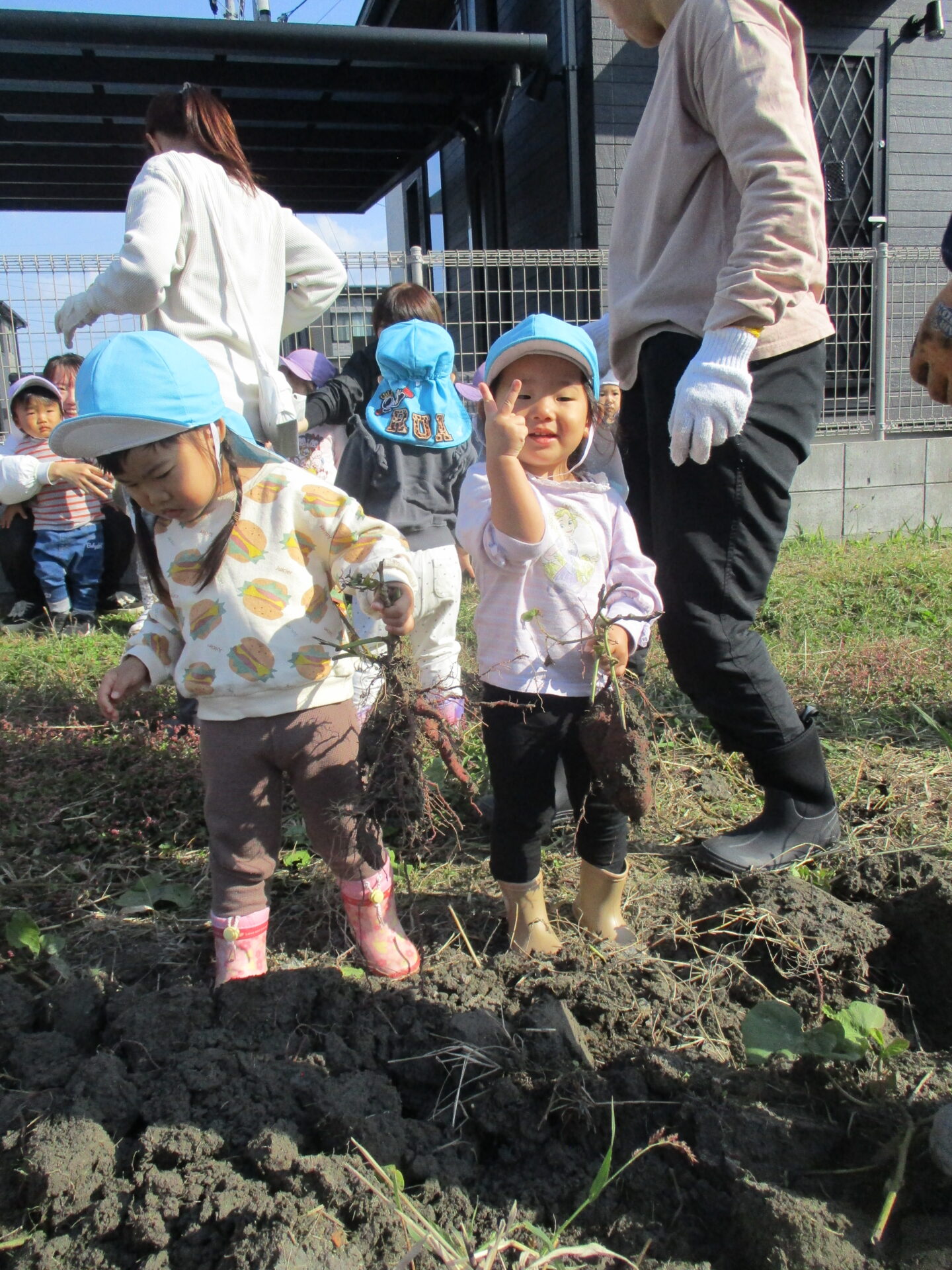 自分で収穫したお芋を持ってとっても嬉しそうな2人💕「こっちにもおいもあるかな?」と、お芋探しに夢中になっていました(⌒∇⌒)