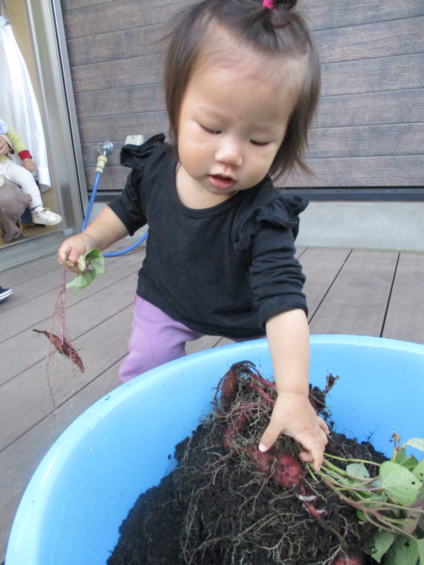 タライに入った芋を掴んだり、蔓を引っ張ったりして興味津々でした(⌒∇⌒)💕