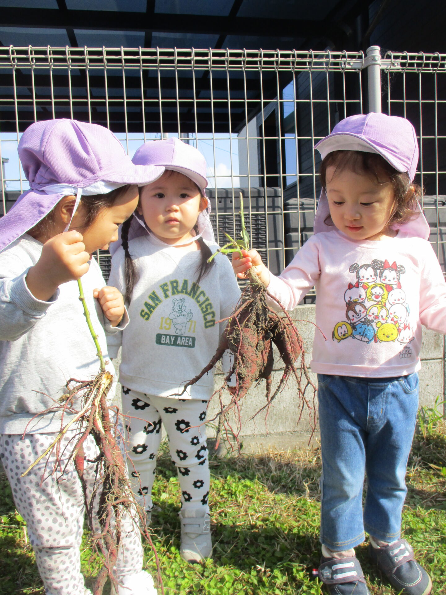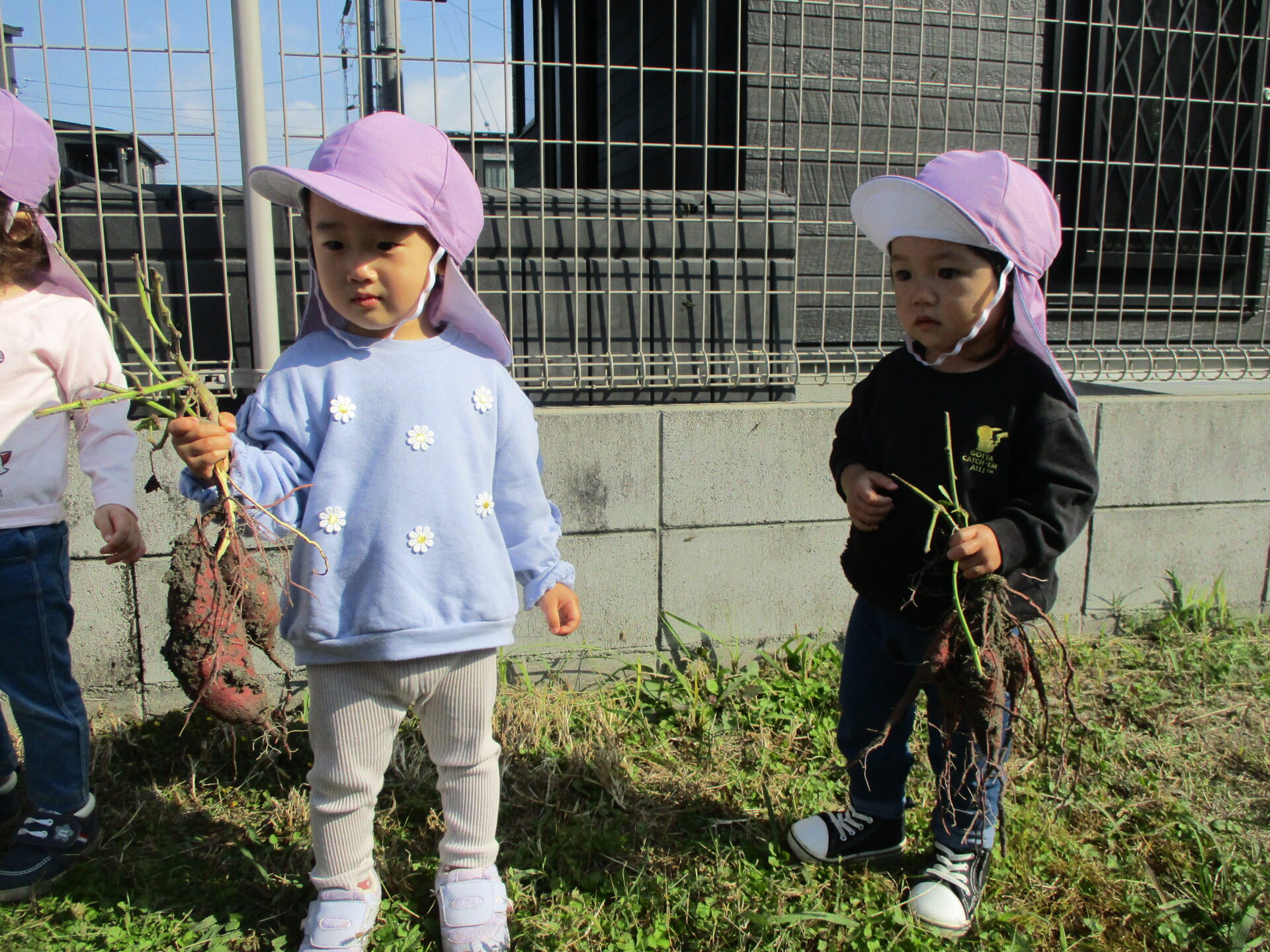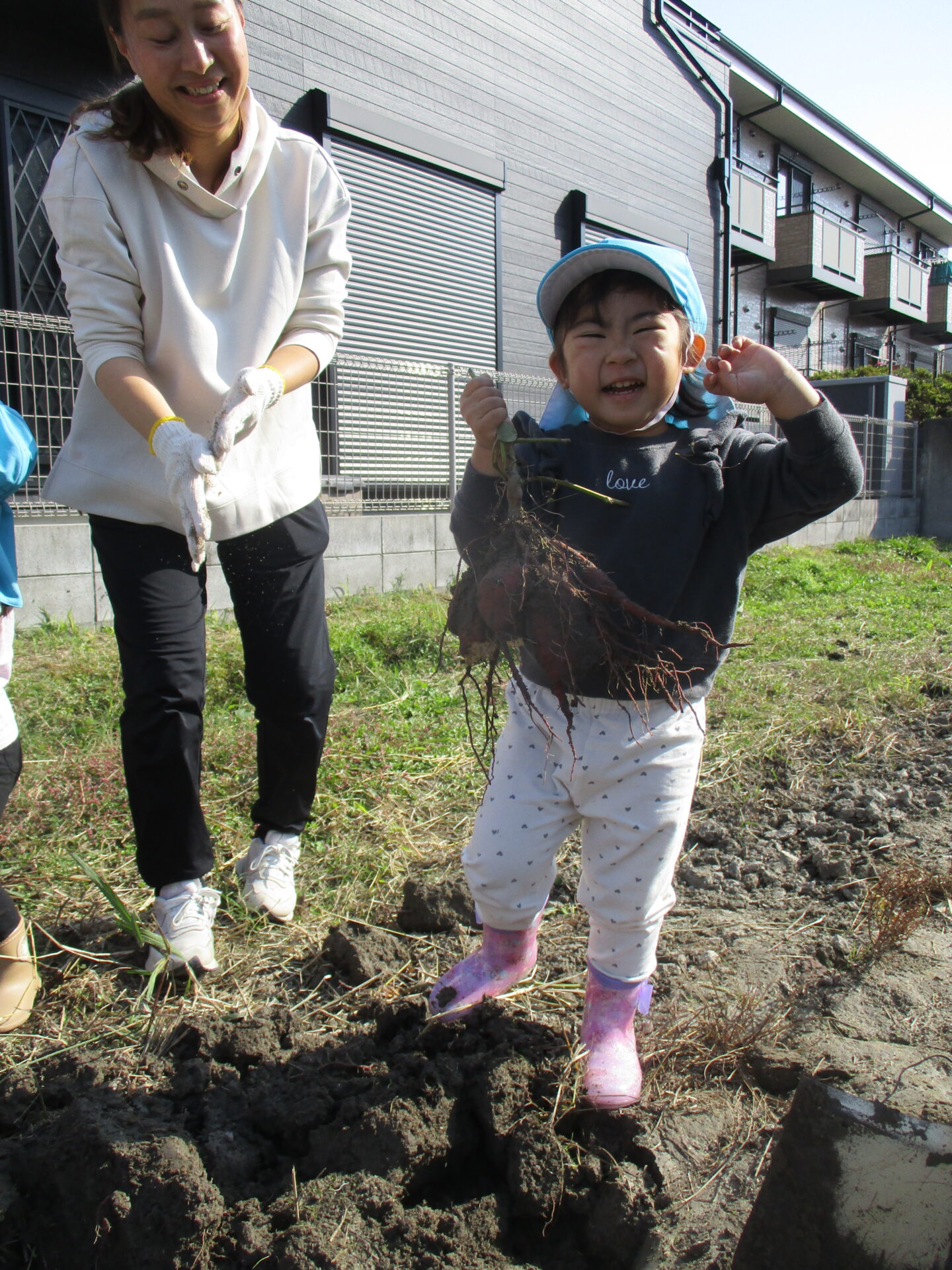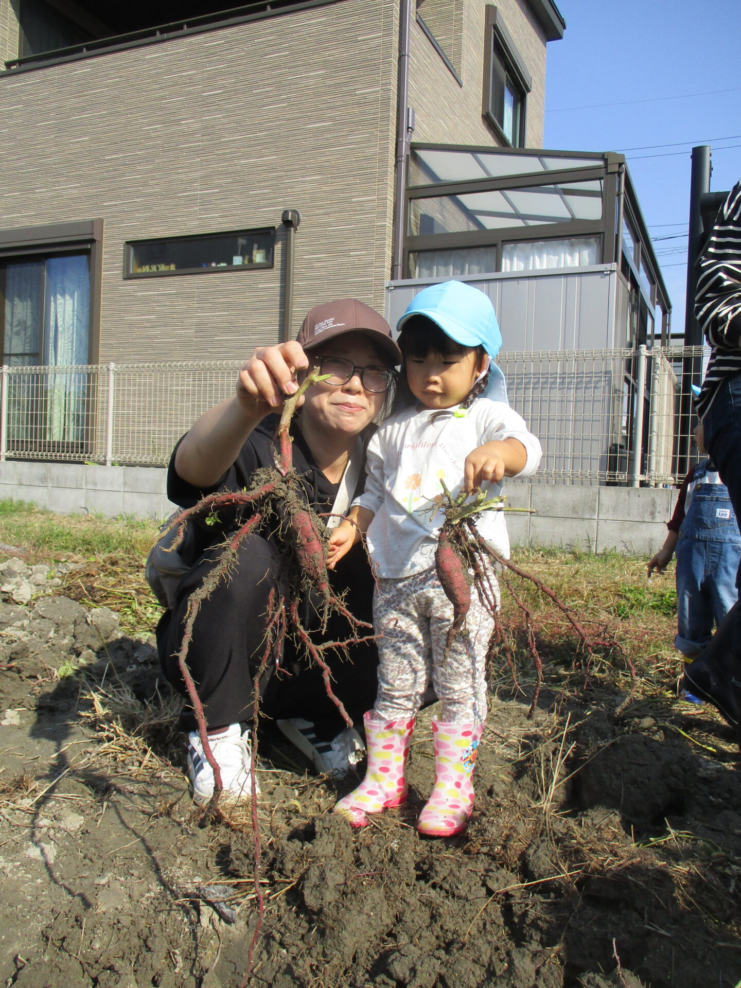 自分で収穫したお芋を持ってとっても嬉しそうな2人💕「こっちにもおいもあるかな?」と、お芋探しに夢中になっていました(⌒∇⌒)