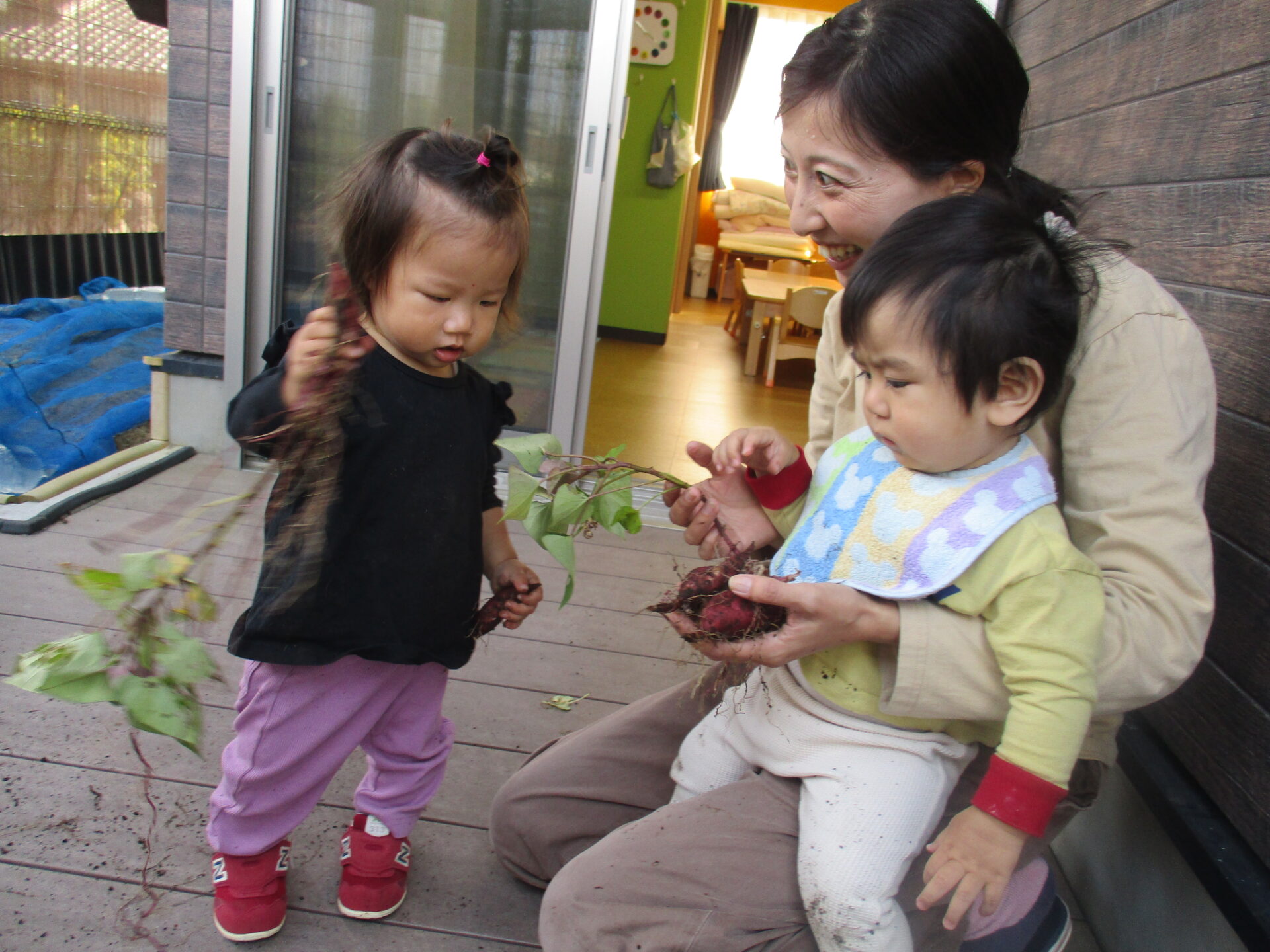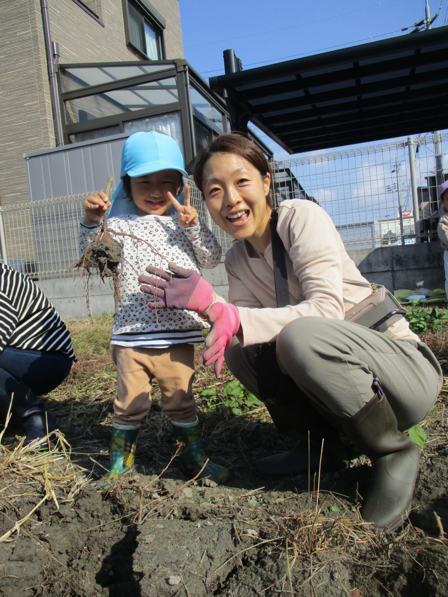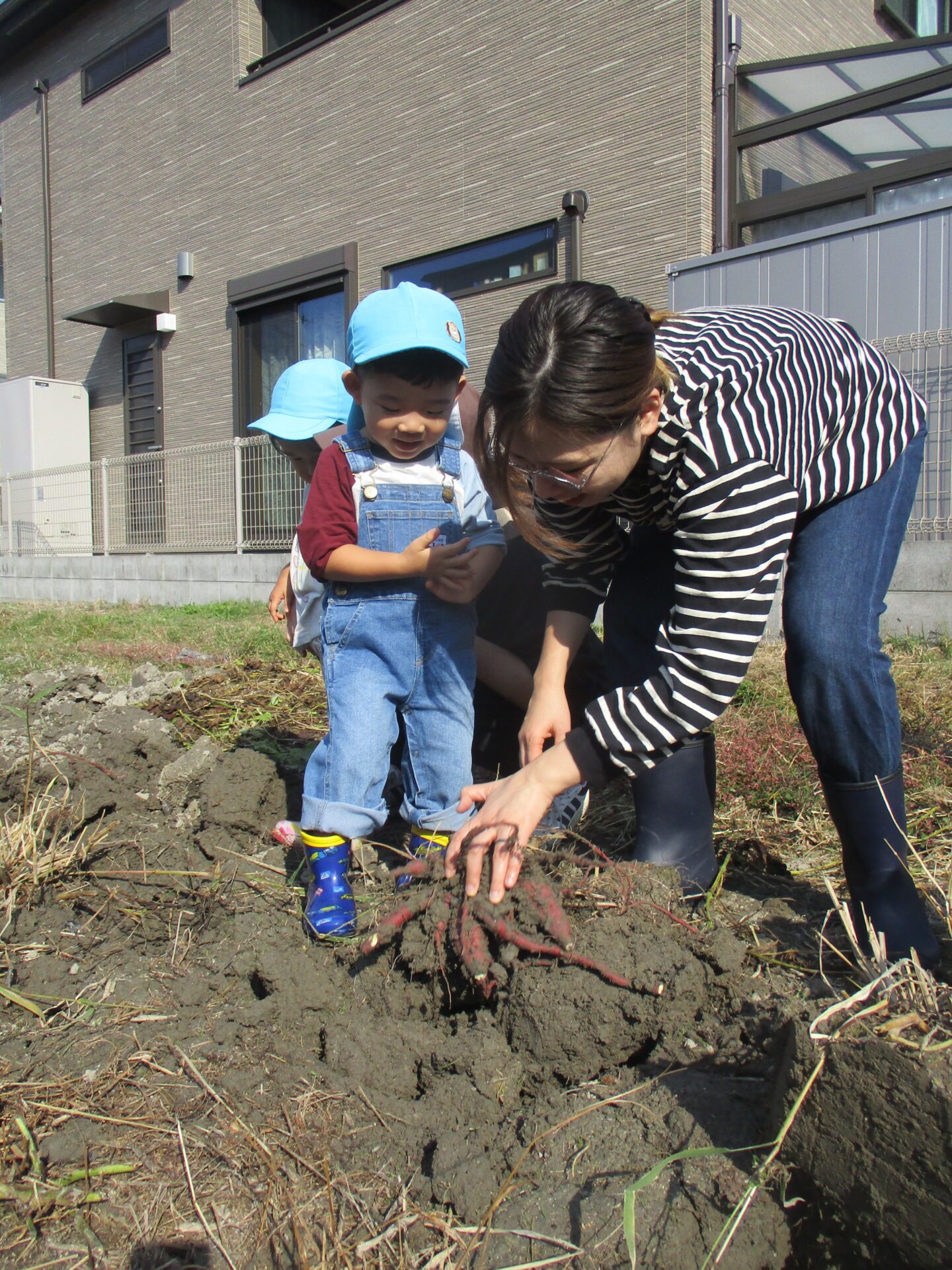 自分で収穫したお芋を持ってとっても嬉しそうな2人💕「こっちにもおいもあるかな?」と、お芋探しに夢中になっていました(⌒∇⌒)