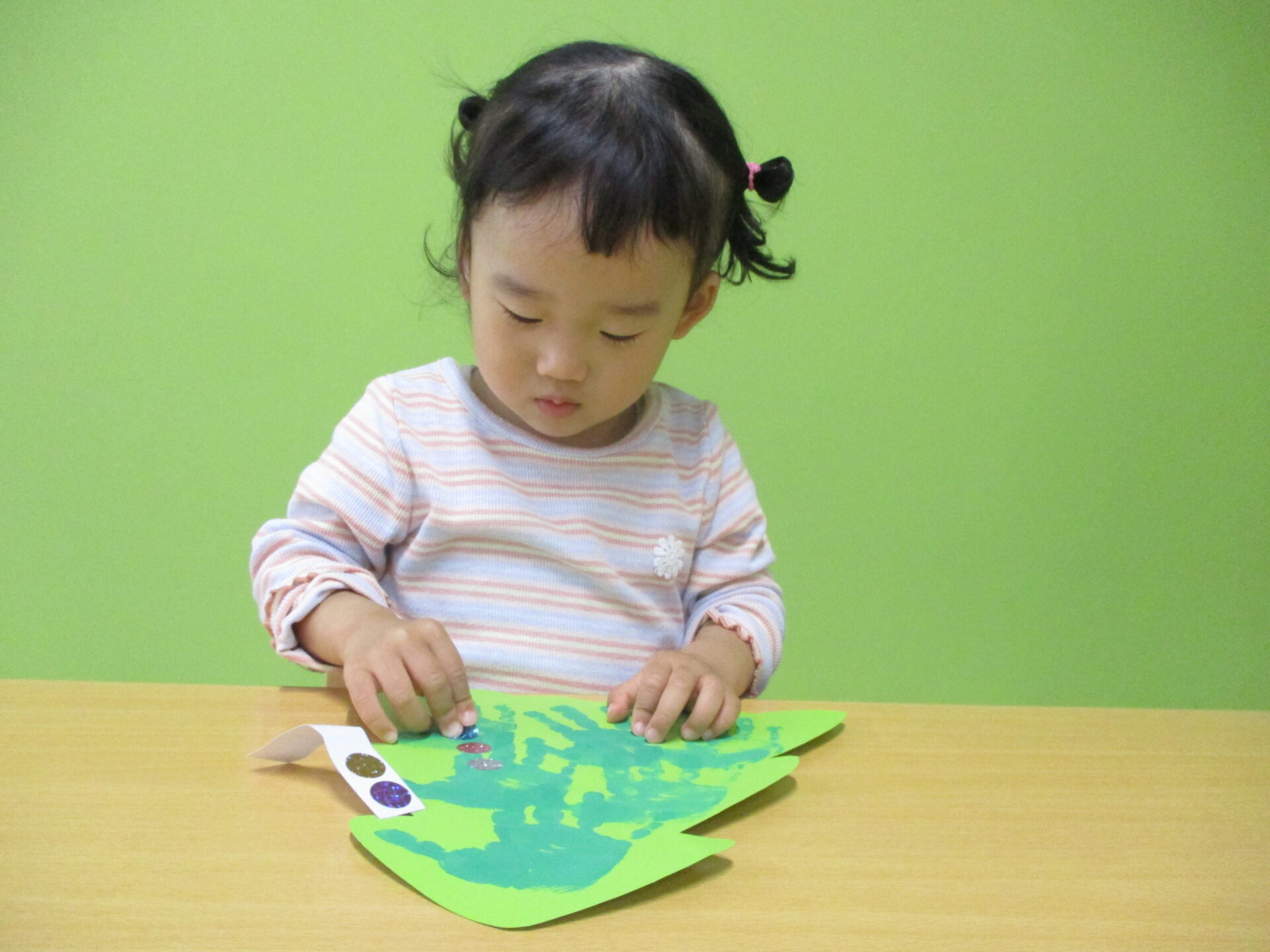 手形が乾いたら、キラキラシールを貼って可愛いツリーに変身です(⌒∇⌒)💕