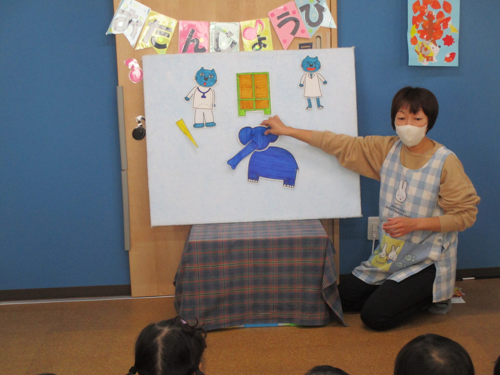 続いて、「ねこのお医者さん」というお話のパネルシアターが始まりました(⌒∇⌒)✨