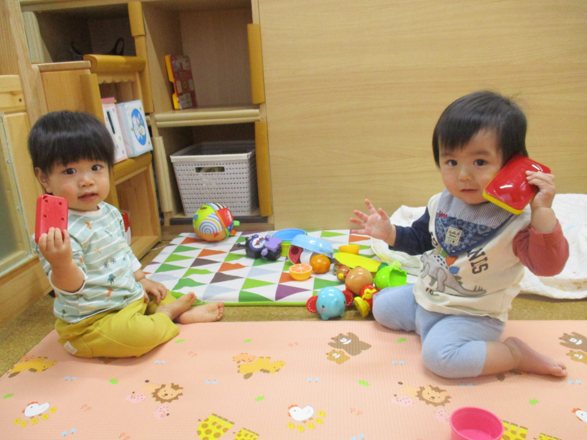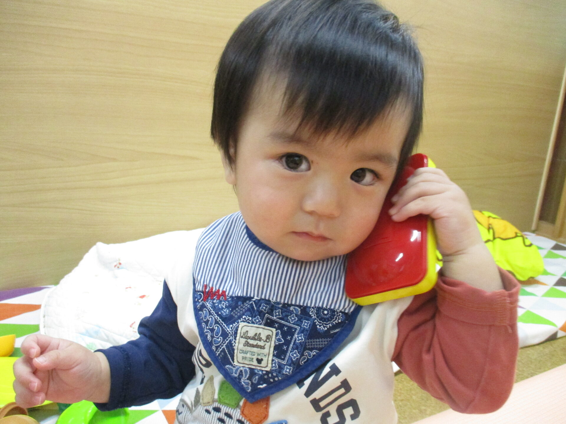 保育者が「もしもし、上手ね💕」と、声をかけるとバッチリのカメラ目線で見せてくれます💓