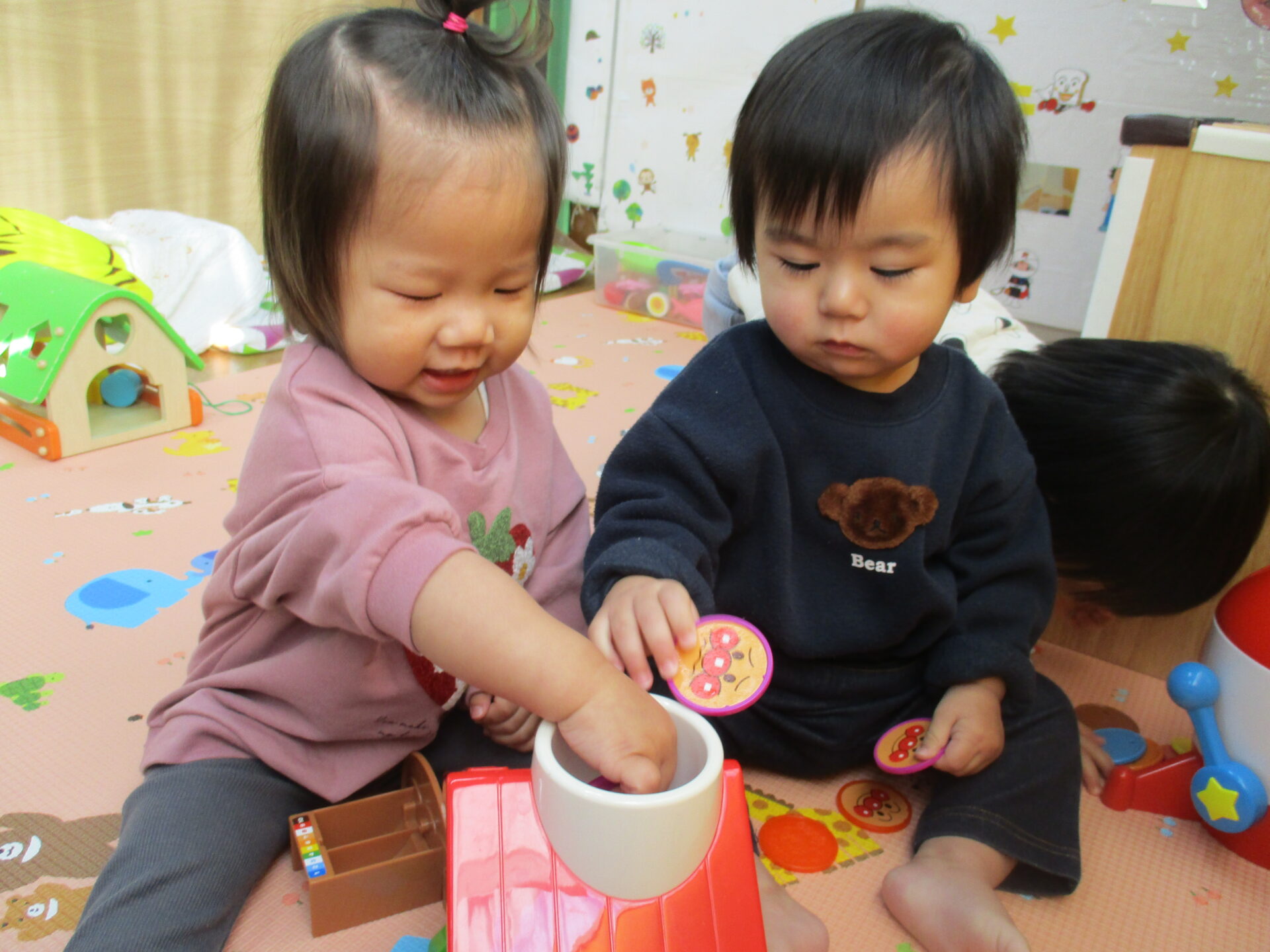高月齢の子どもが「どうぞ!!」と言いながら友達にコインを手渡し、2人で仲良くポットン落としを楽しんでいました🎵