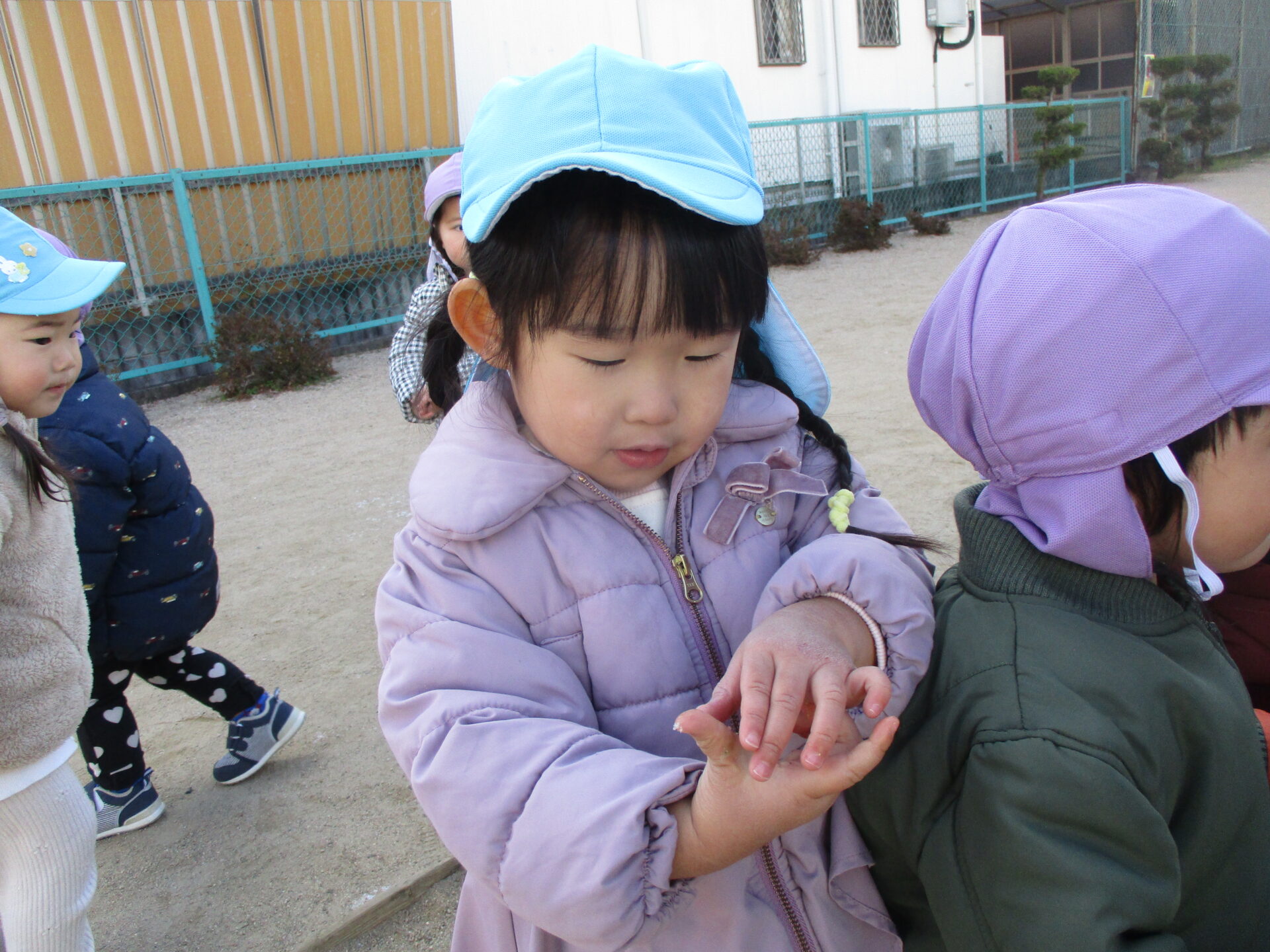寒い中ですが、お友だちや保育者と一緒に体を動かしたり、霜を見つけて触ってみたり・・・✨