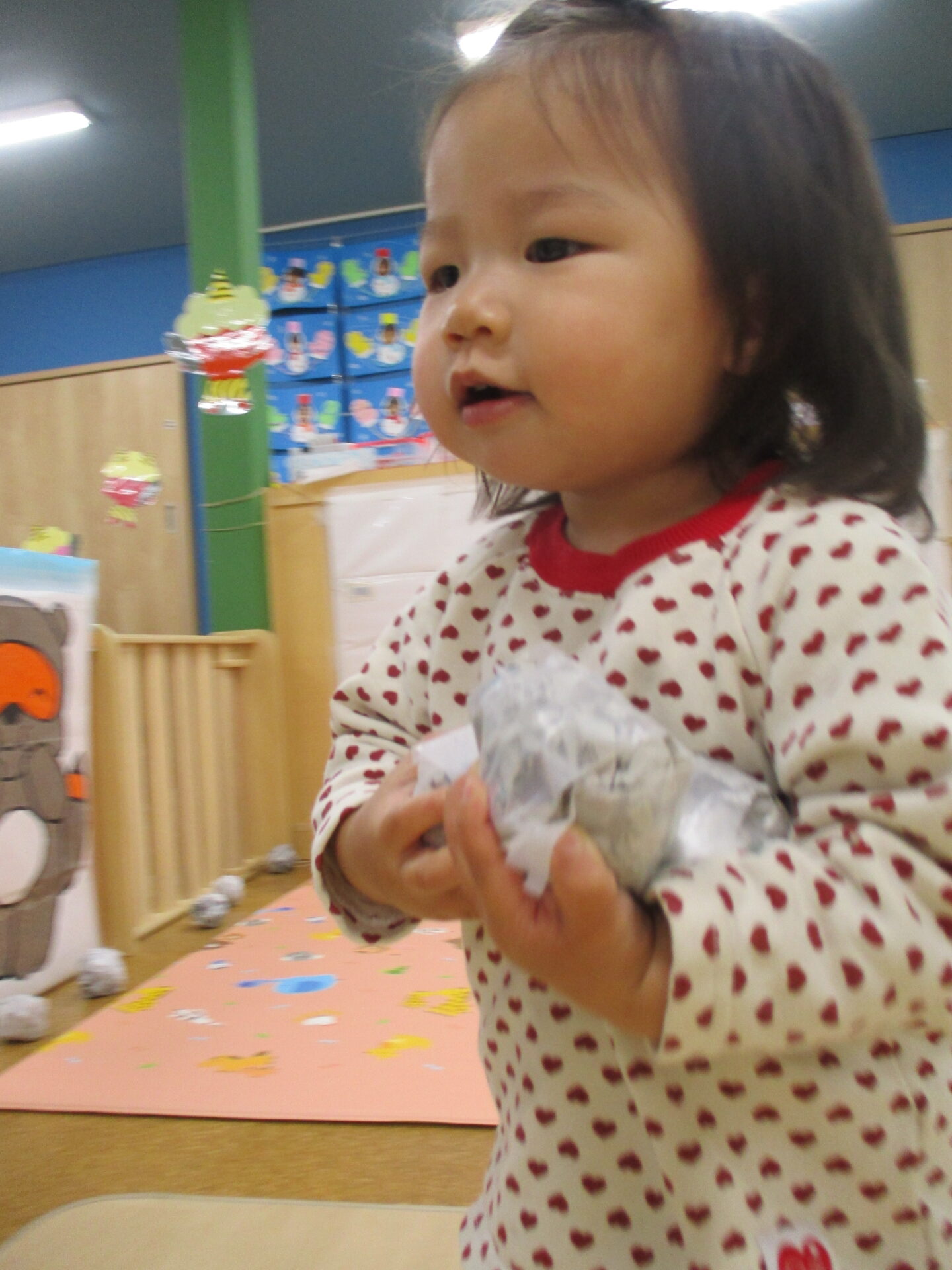 やる気満々!!両手いっぱいに新聞豆を抱えます😊