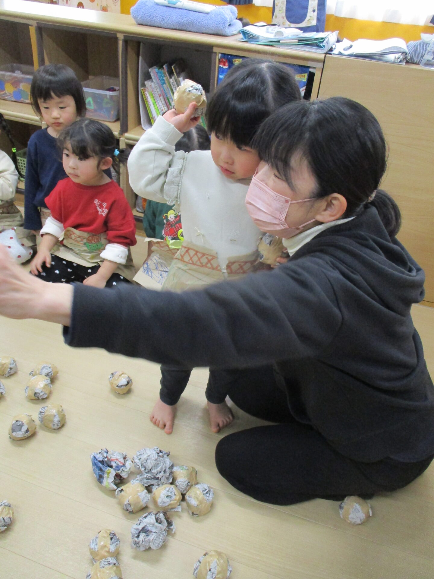 各チームで豆まきに向けて新聞豆を作り、今日の日を楽しみにしていました😊