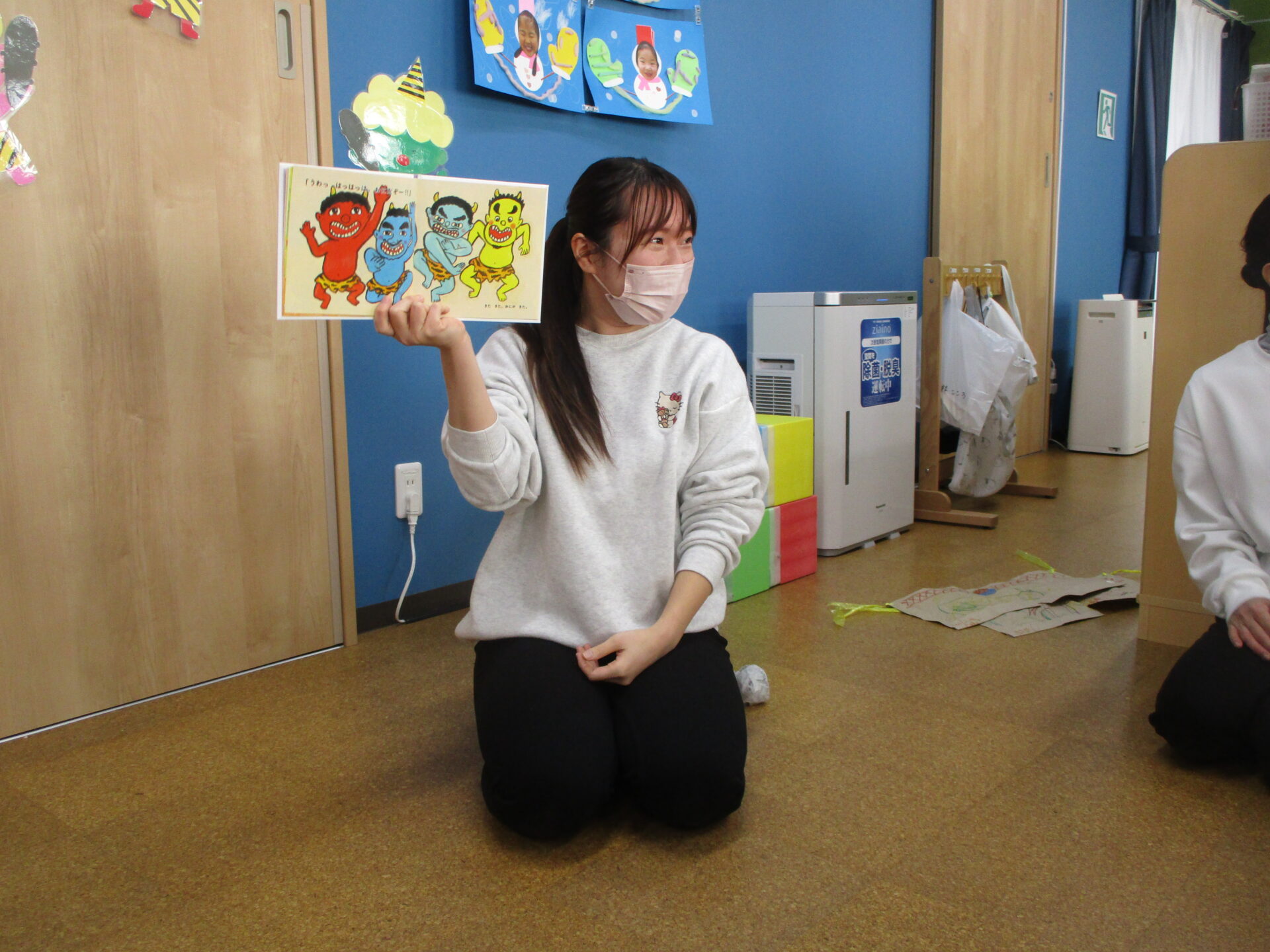 楽しく歌をうたって、さぁ豆まきをしよう!!張り切るみんなです✨
