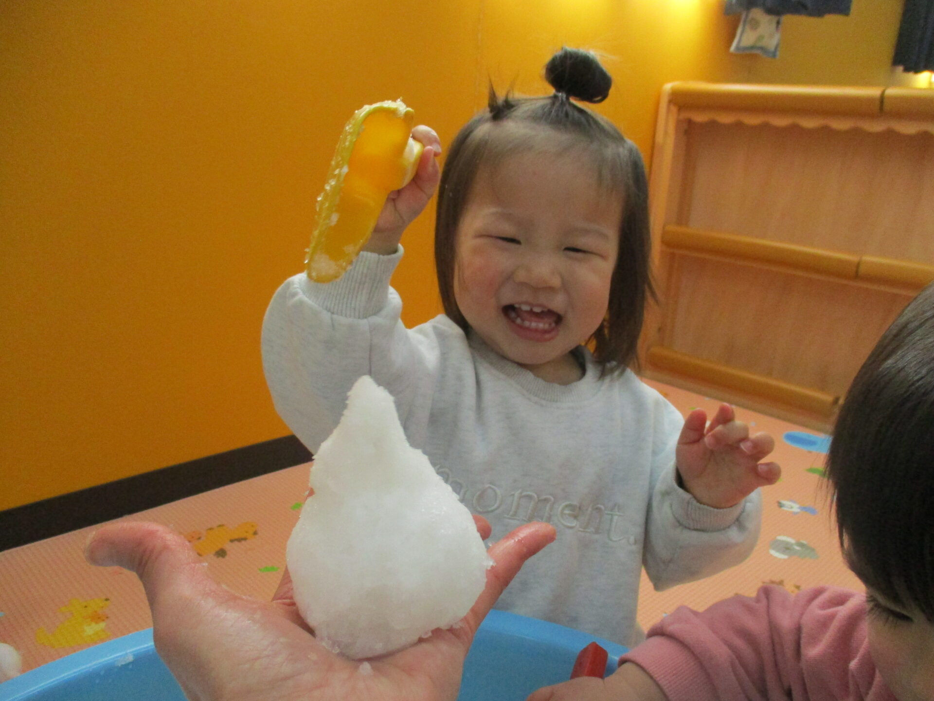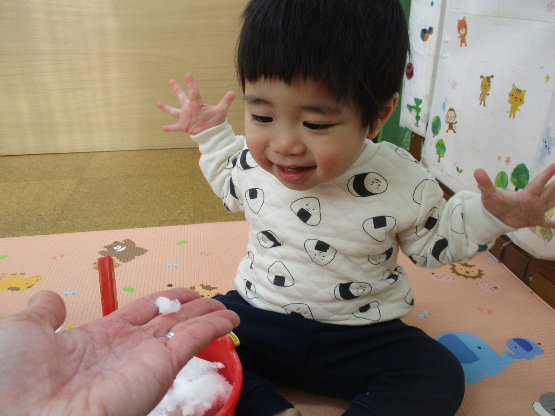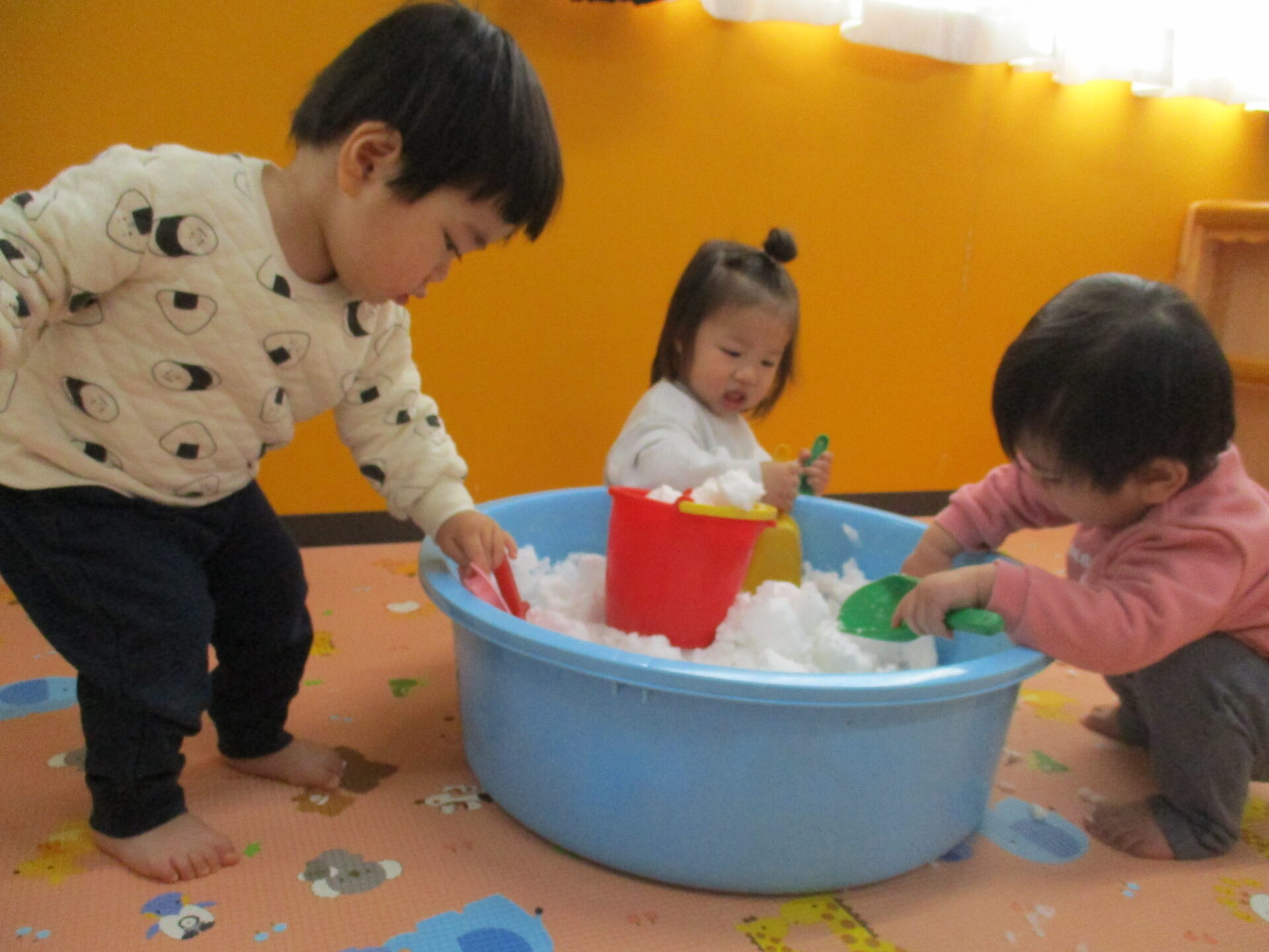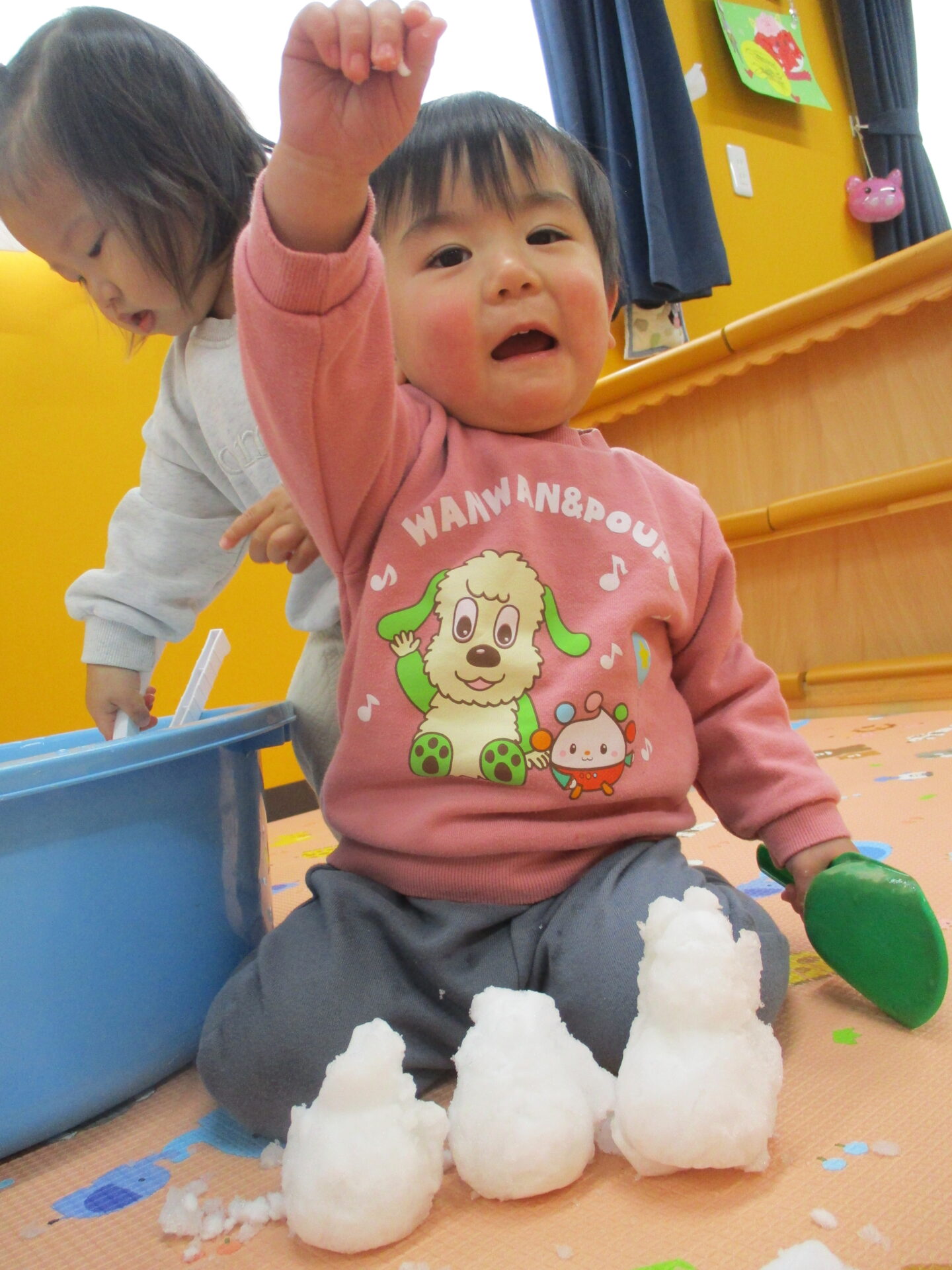 きれいに積もった雪を触ってもらいたい💓と思い、タライに雪を入れて室内で雪遊びを楽しみました☺