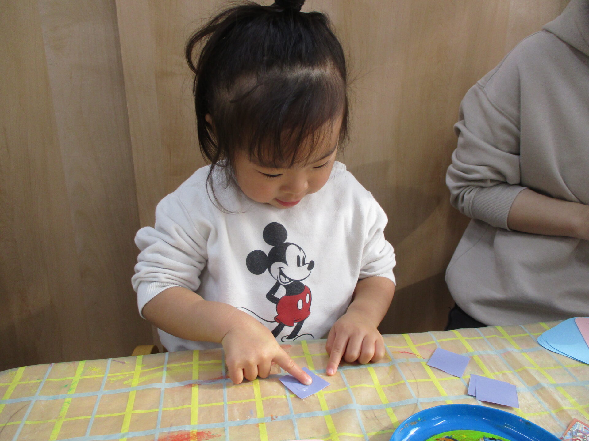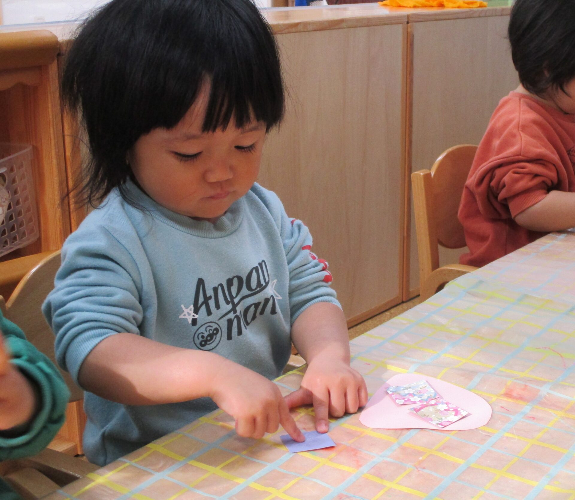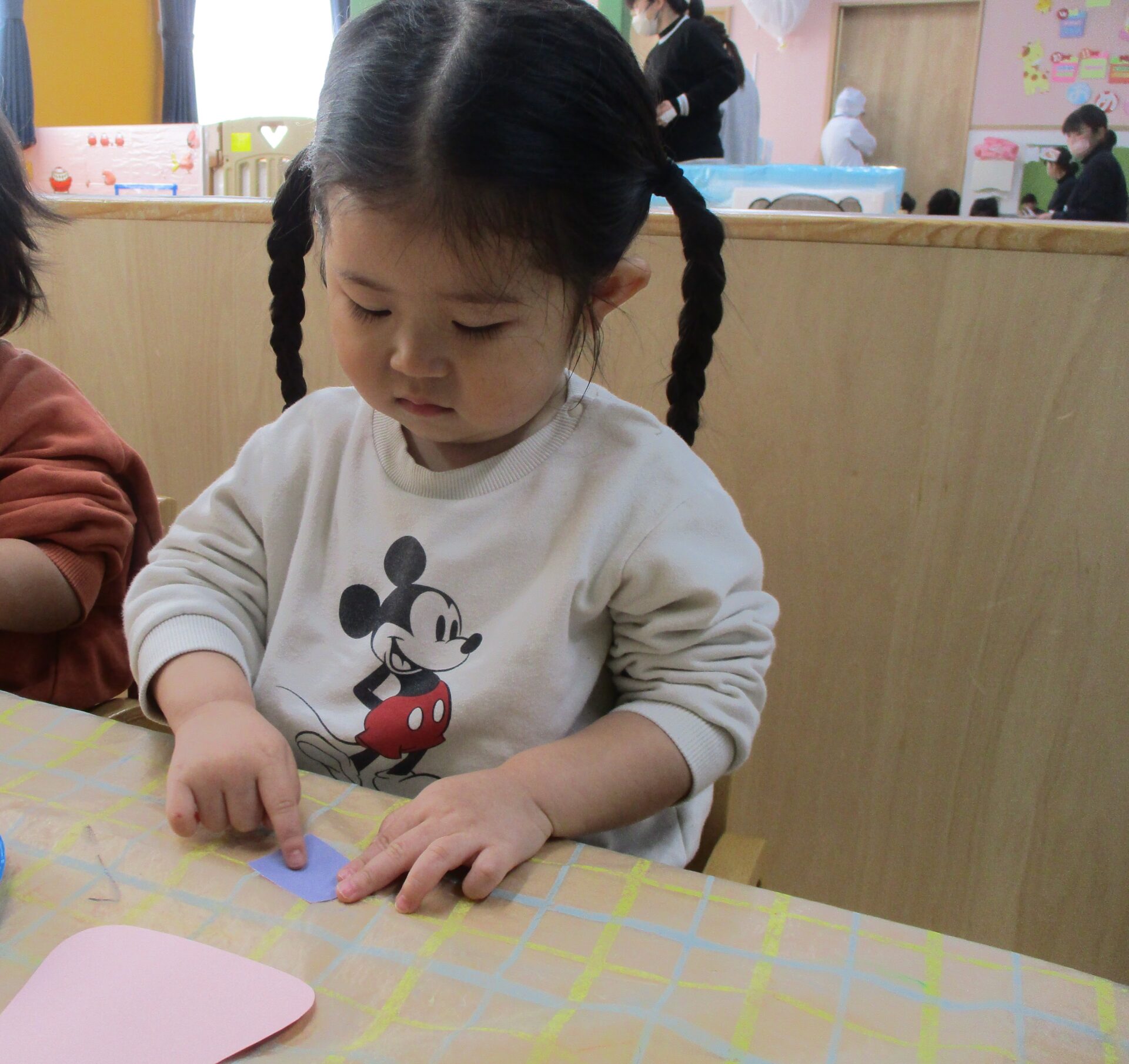 今回、制作で初めてのりに挑戦しました😊✨初めに保育者が使い方をやってみせると、興味津々!恐る恐るのりに触れ、しばらく集中して取り組んでいました!!