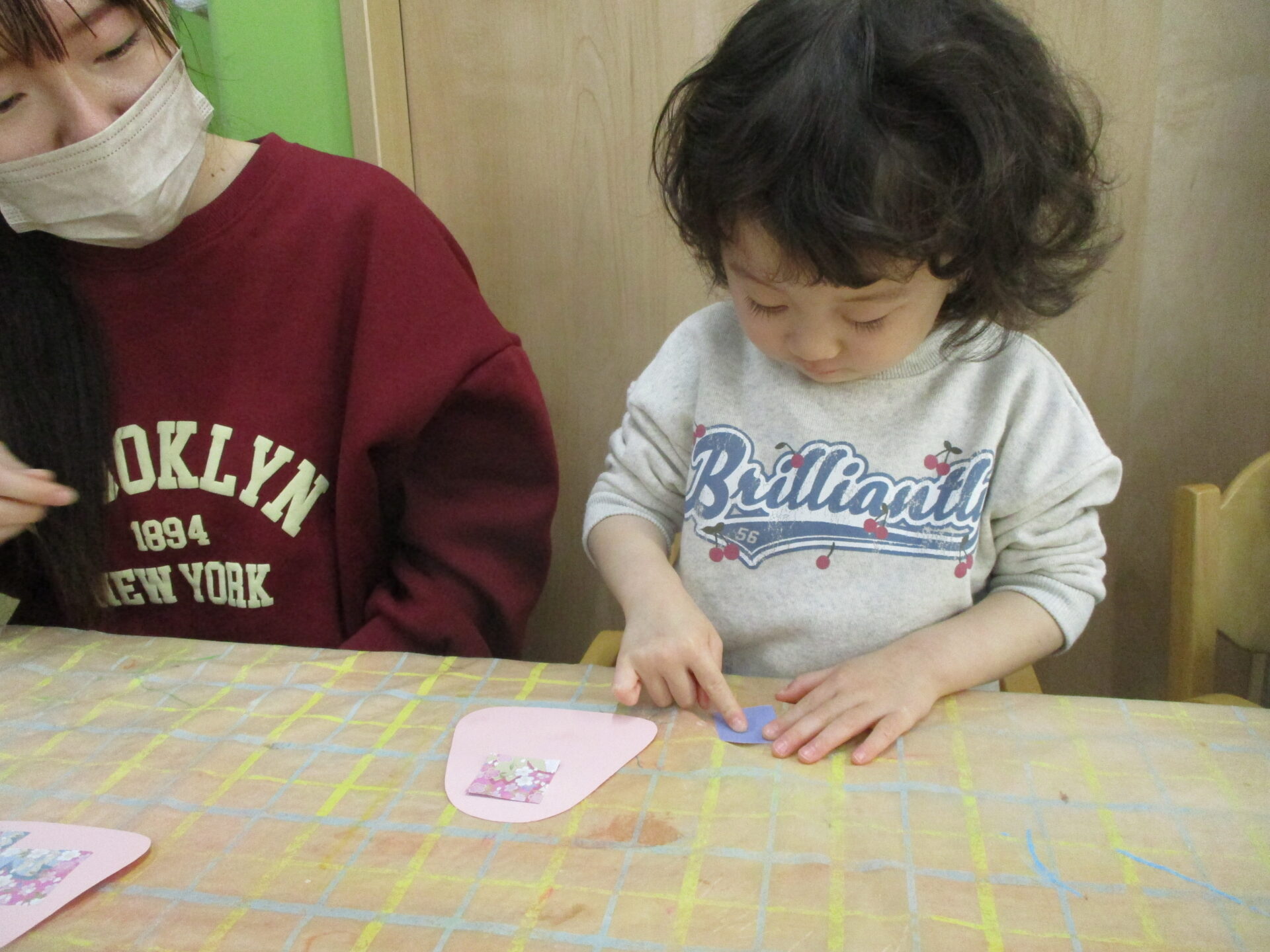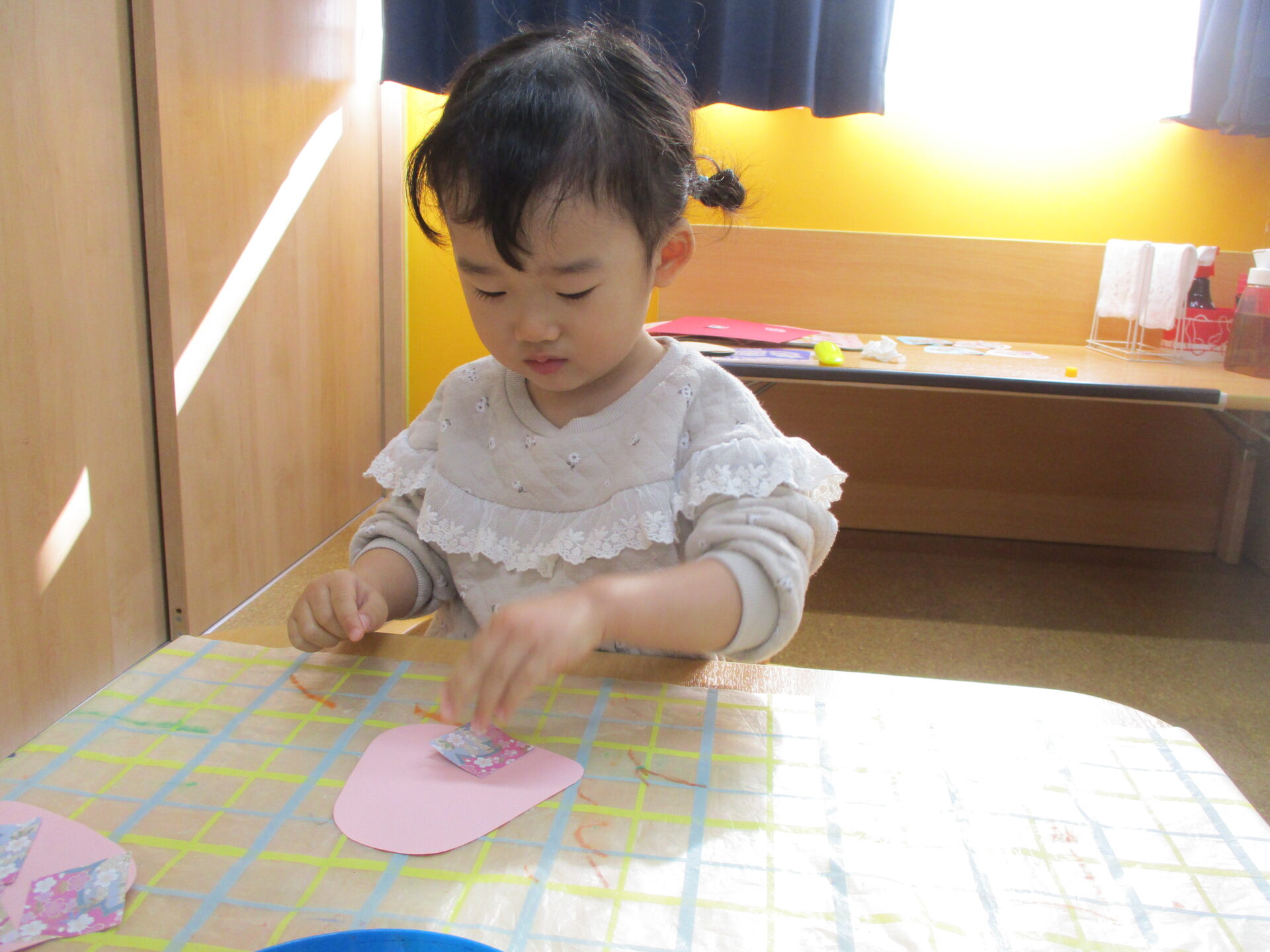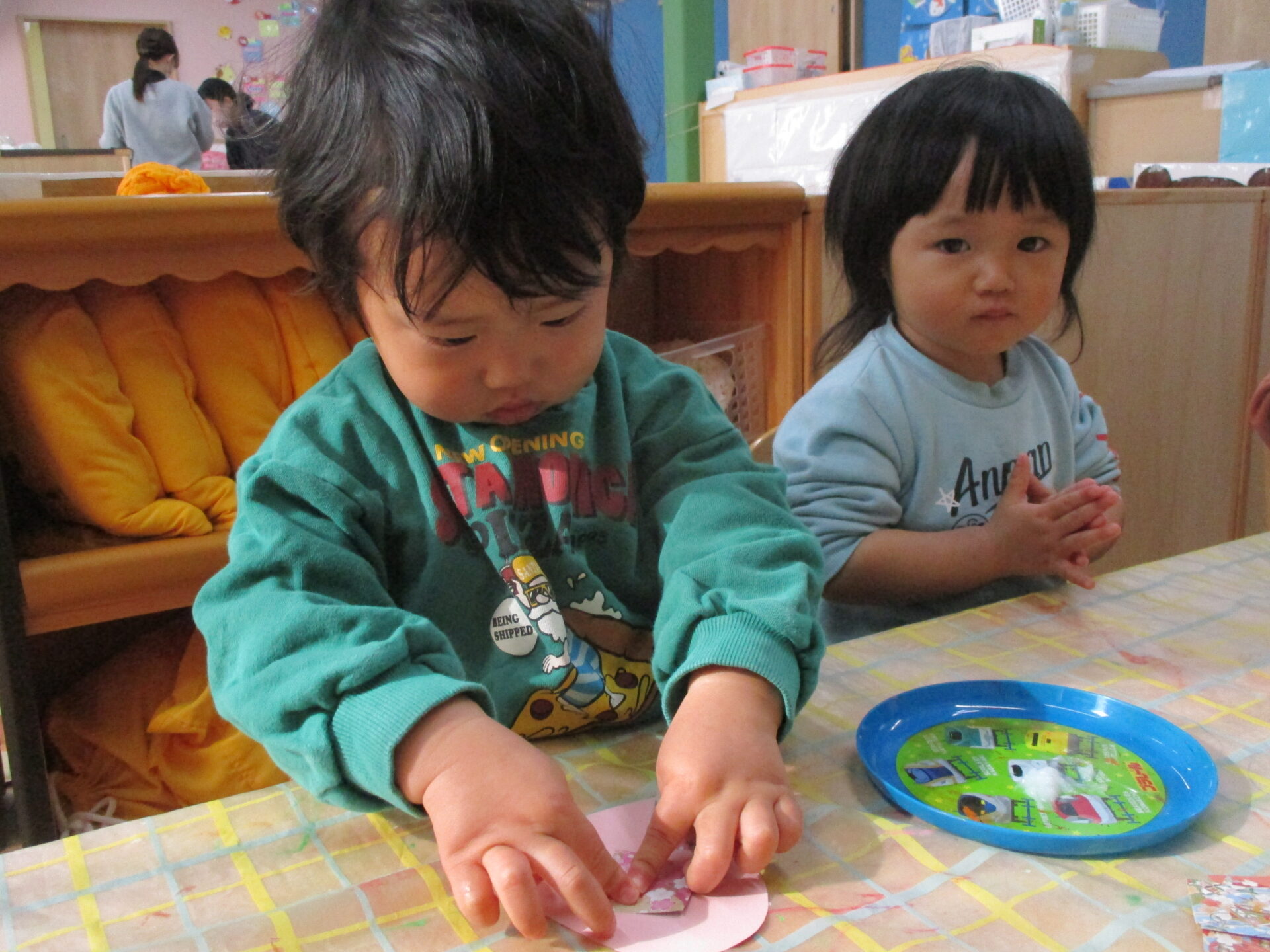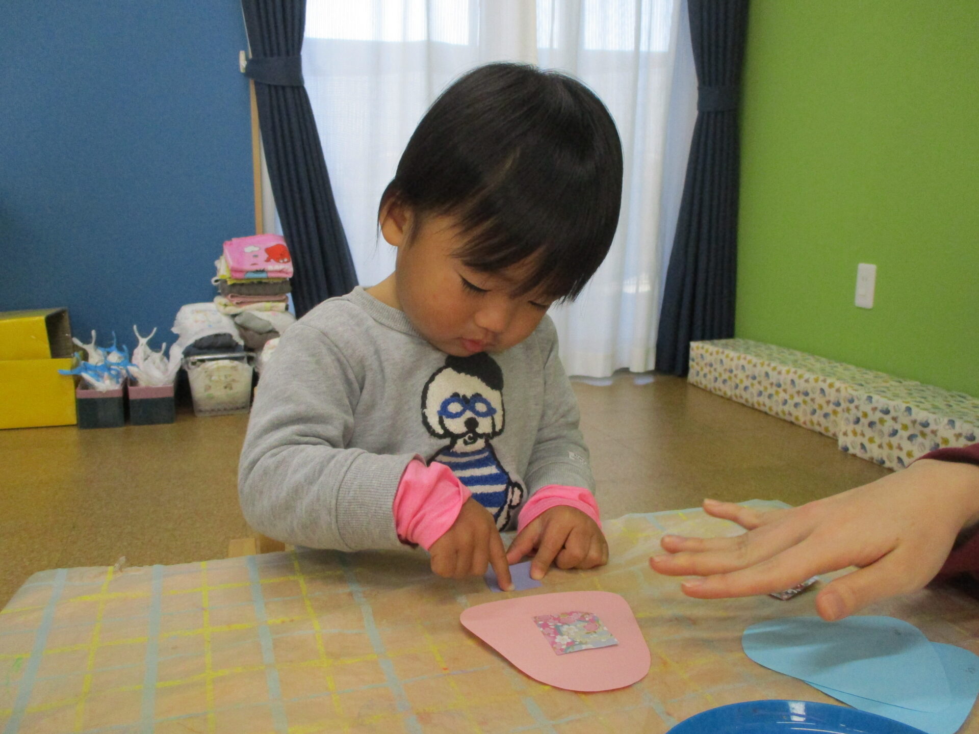 今回、制作で初めてのりに挑戦しました😊✨初めに保育者が使い方をやってみせると、興味津々!恐る恐るのりに触れ、しばらく集中して取り組んでいました!!