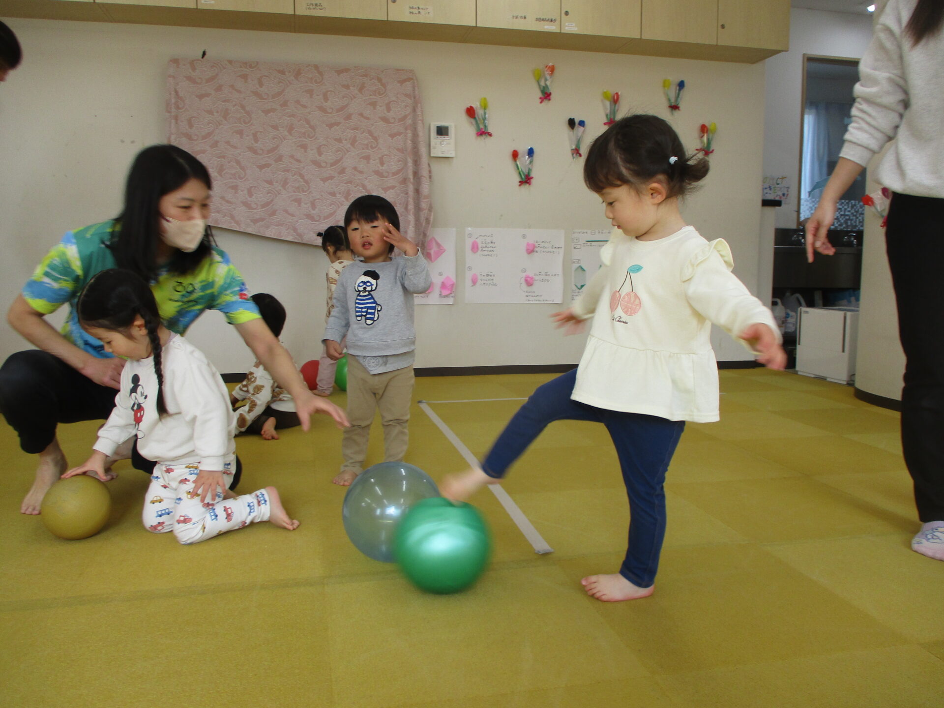 今年度最後の体操教室の様子をお届けします!!今回コーチたちは、いつものマットや鉄棒ではなくボール遊びを準備してきてくれました✨