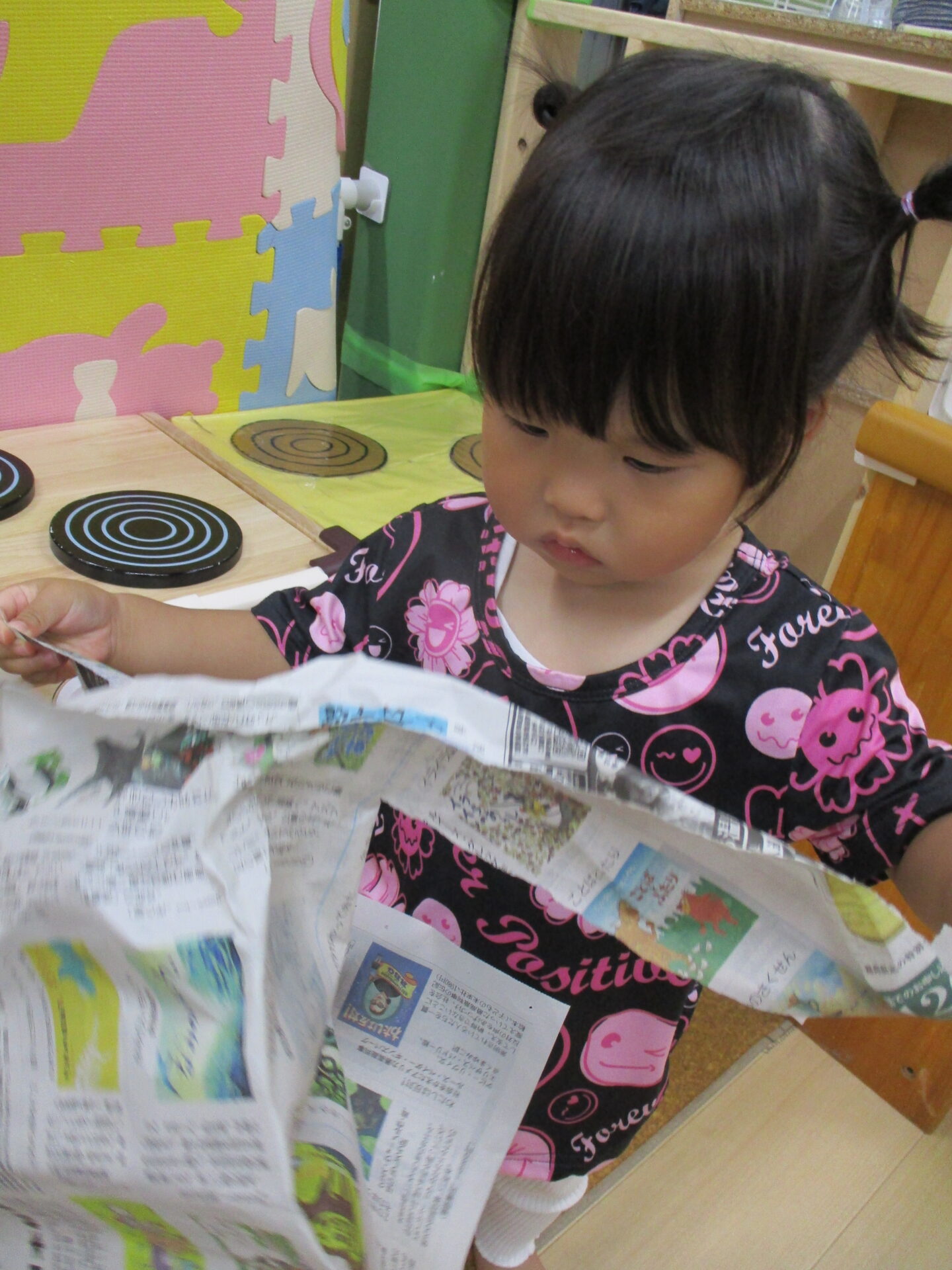 新聞をちぎったり、丸めたりすることで指先の力を養ったり、全身を使って伸び伸びと体を動かして遊ぶ心地良さが味わえます😊