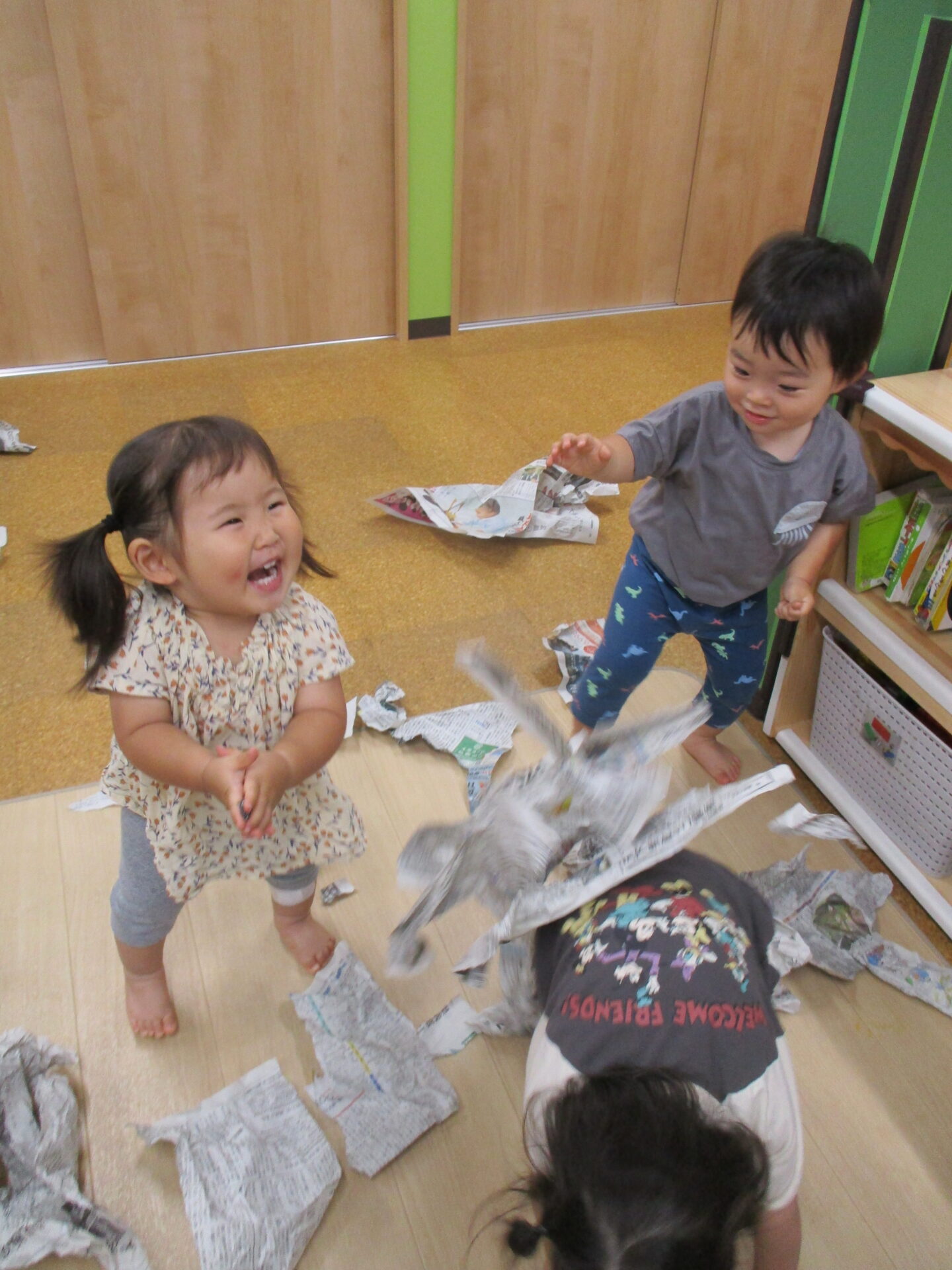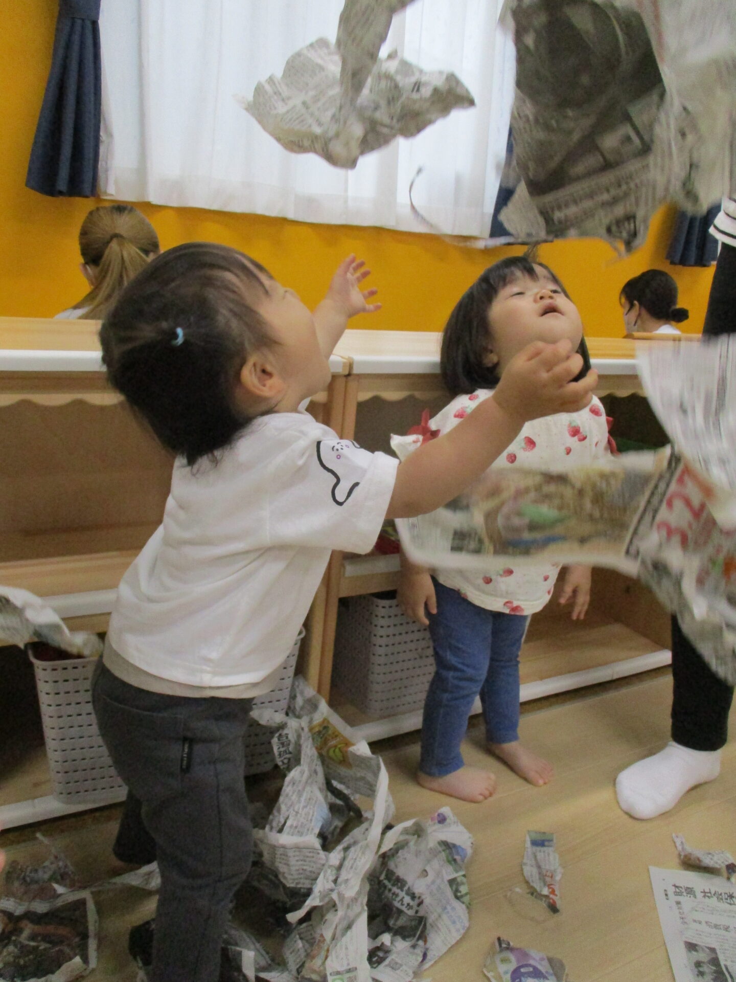 保育者が破れた新聞を集めて「それ~!!」と、舞わせると「きゃー💕」と、大喜びの子どもたち🎵