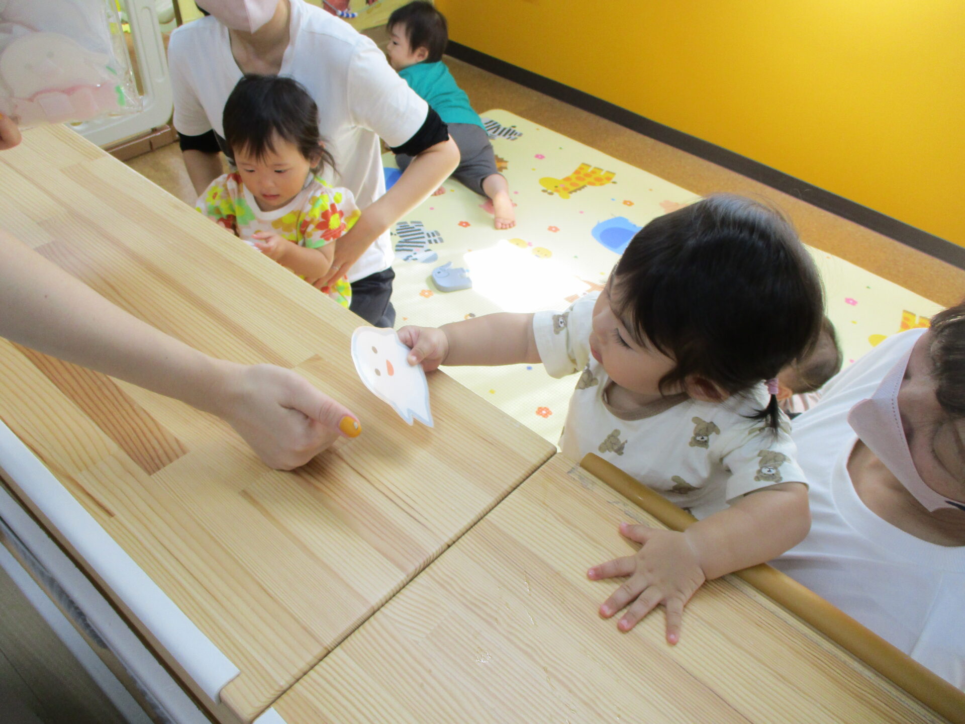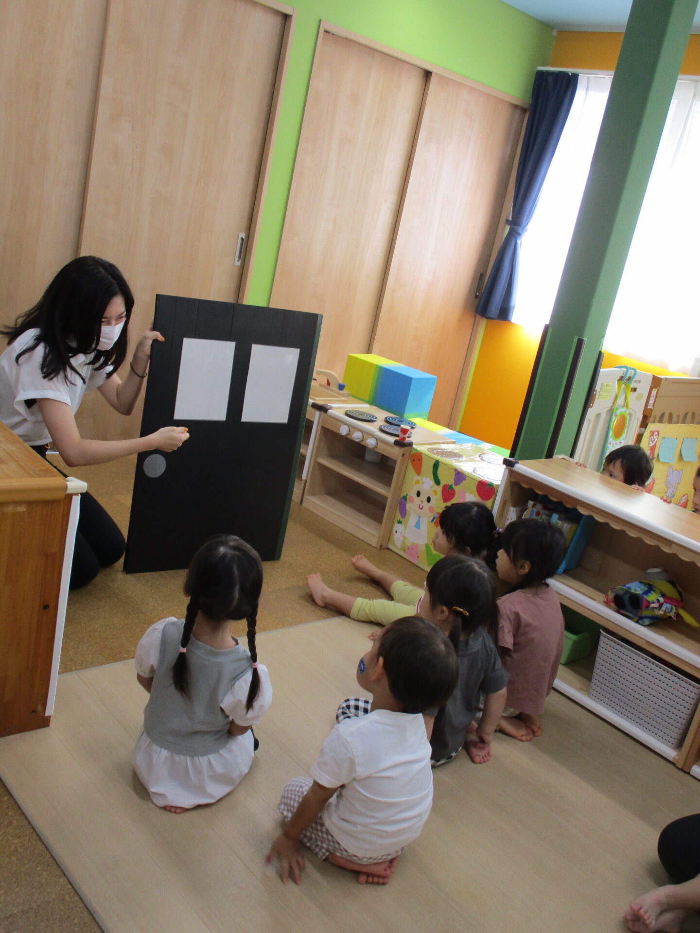 英語の先生の「誰かのお家なんだけど、トントントンってノックしてくれるお友達いるかな?」との言葉に、あめチームの子どもが「やってみる!!」と手をあげました✌