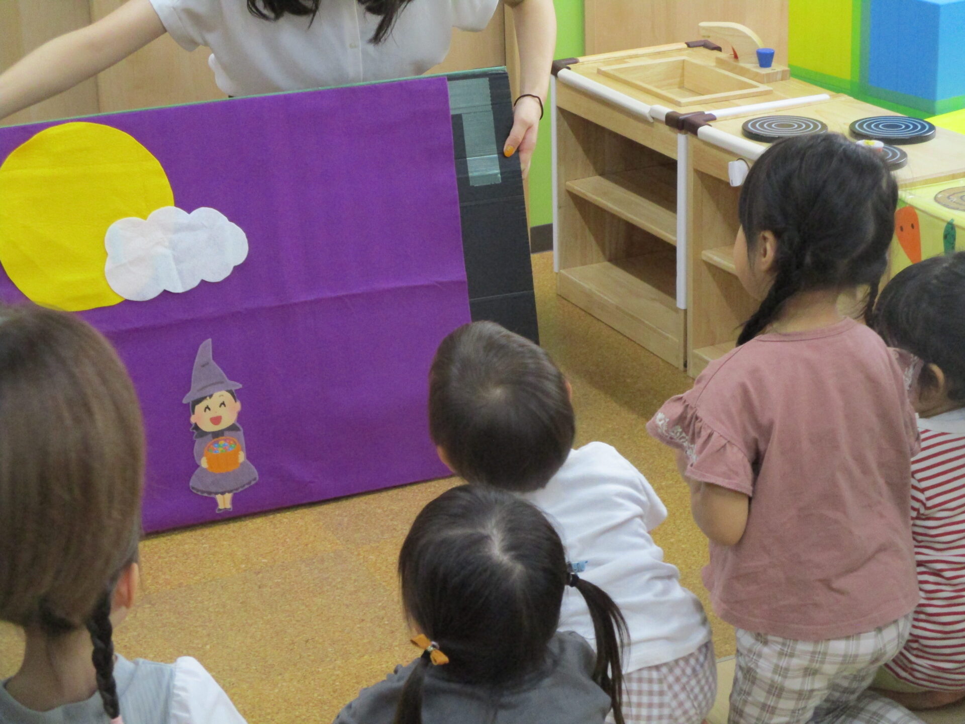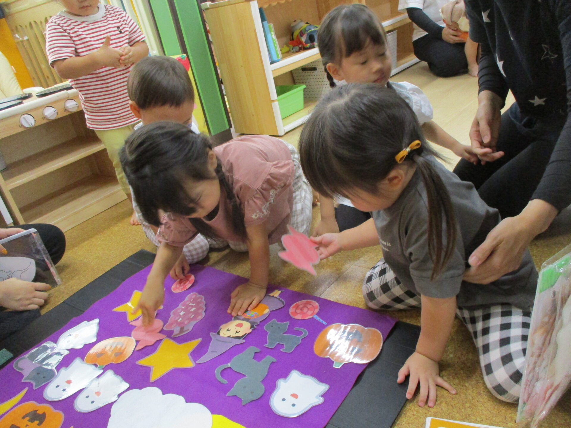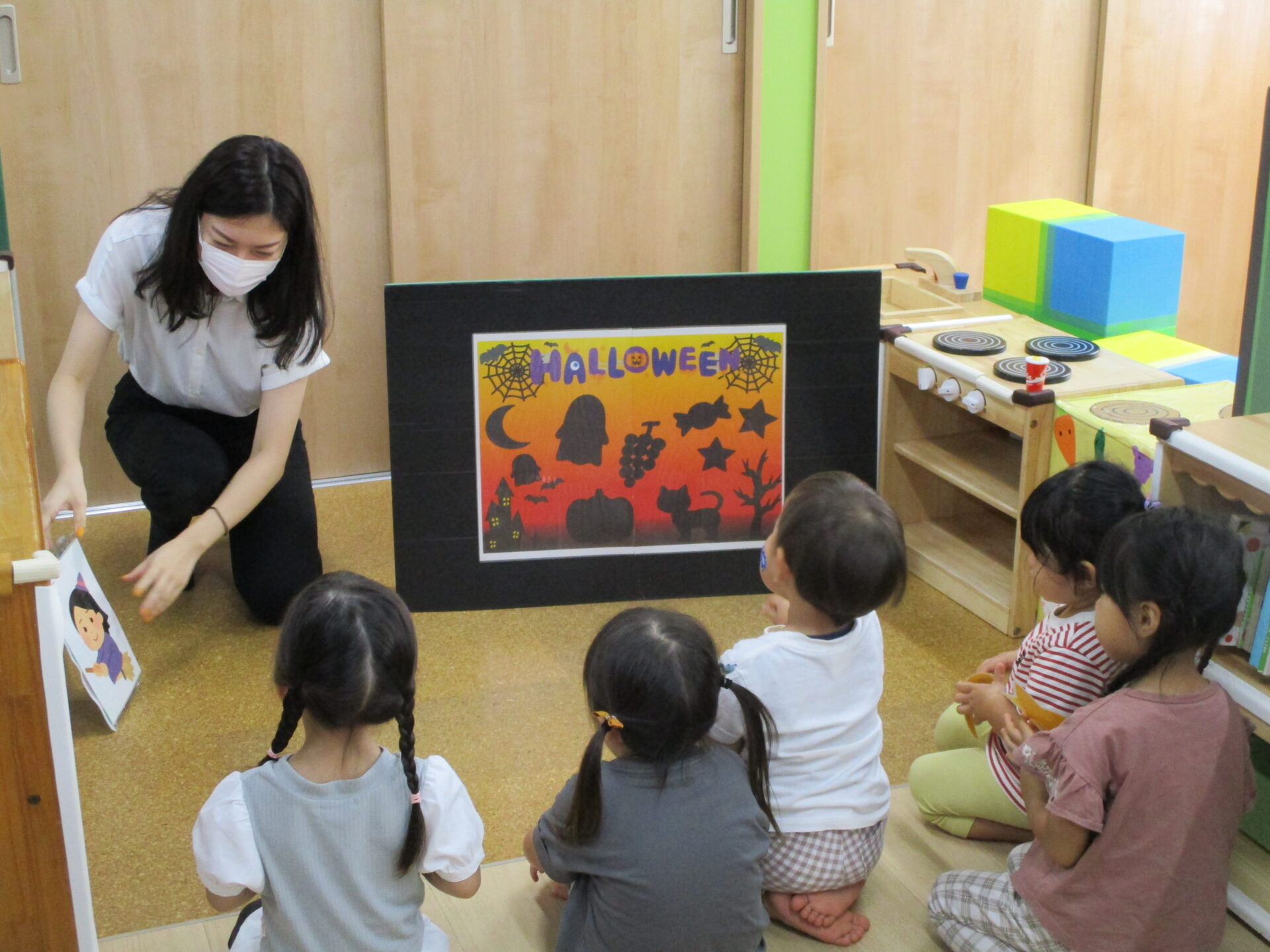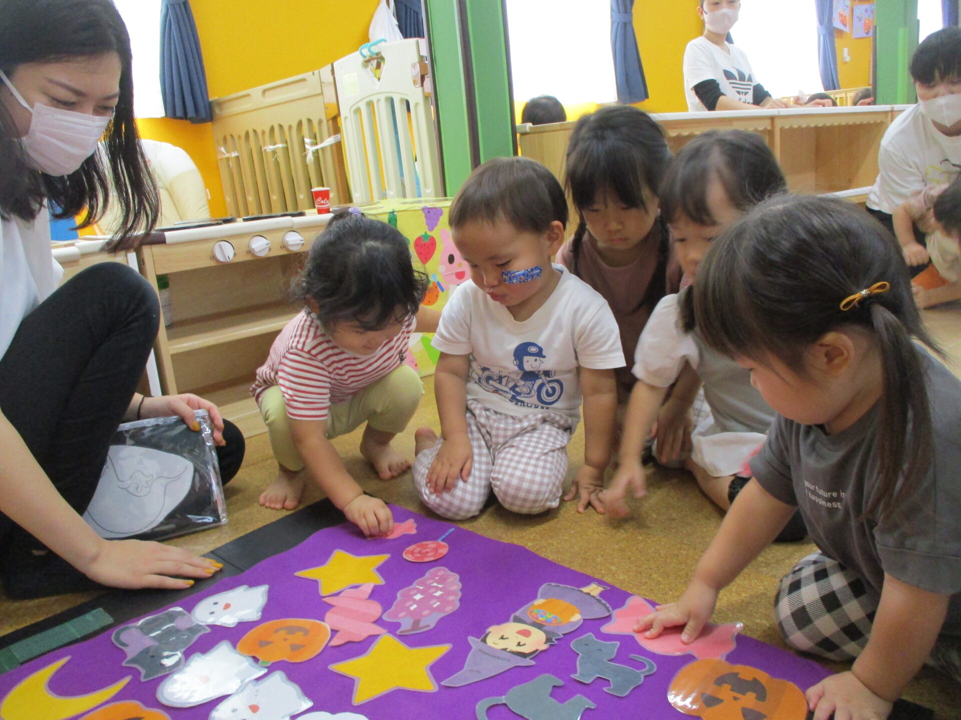 「魔女さんのお家を、みんなでかわいくしてあげよう!!」と英語の先生が子どもたち一人ひとりに飾りを手渡してくれます😊