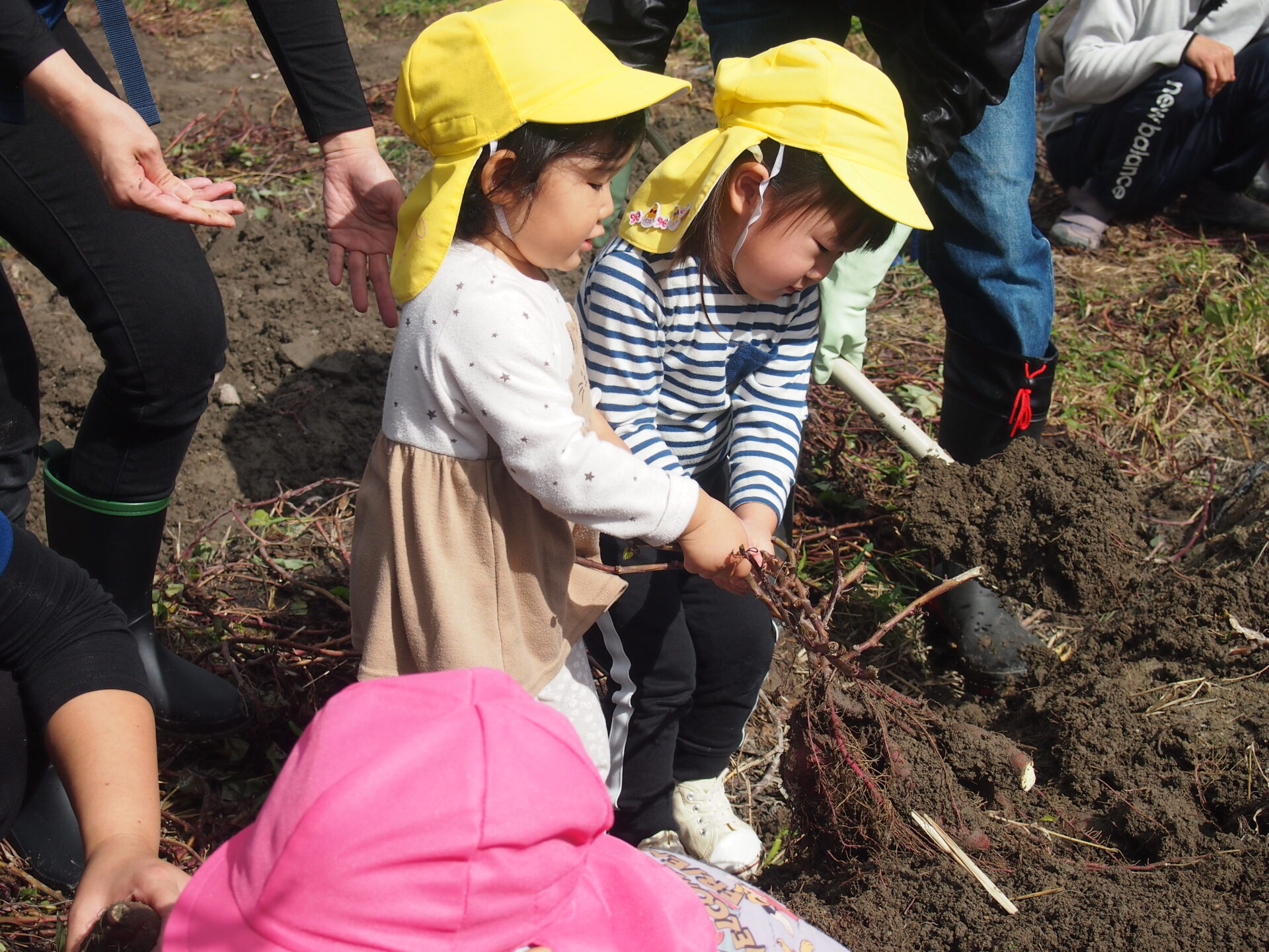 掘り起こした土の中から、子ども達がさつま芋を見つけたり、ツルを引っぱたりして収穫していきました(⌒∇⌒)