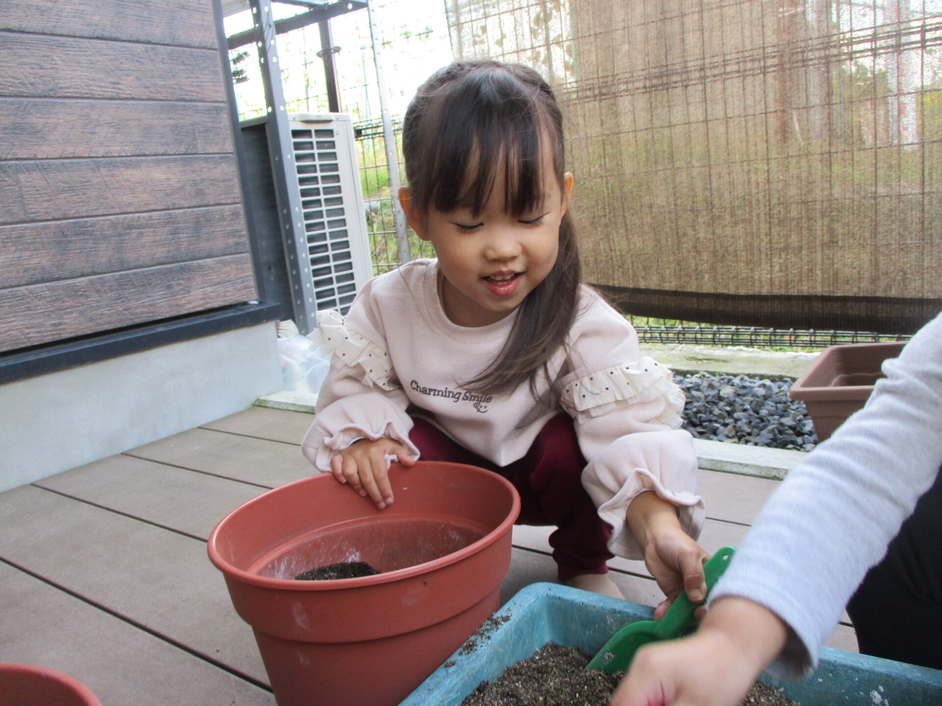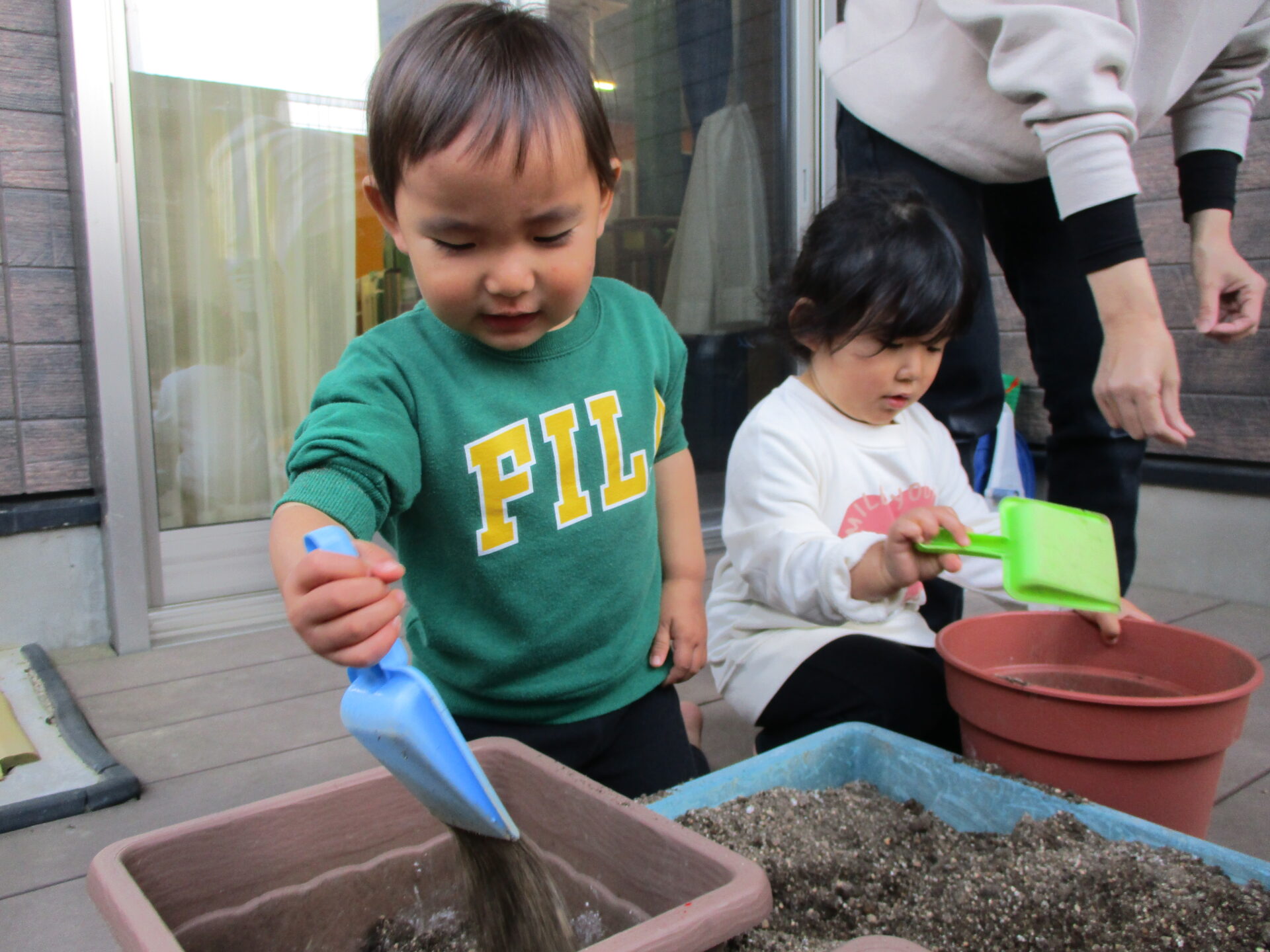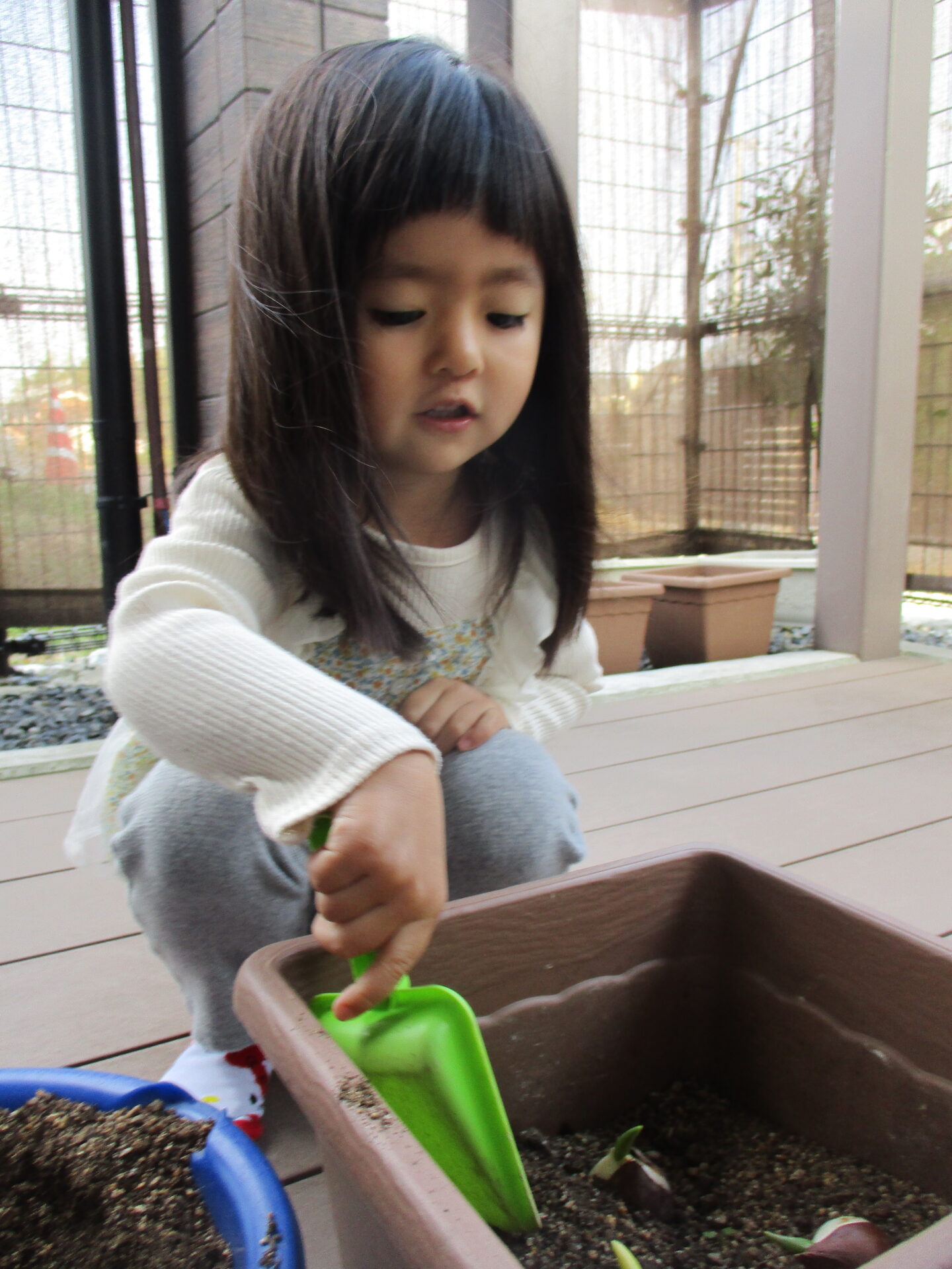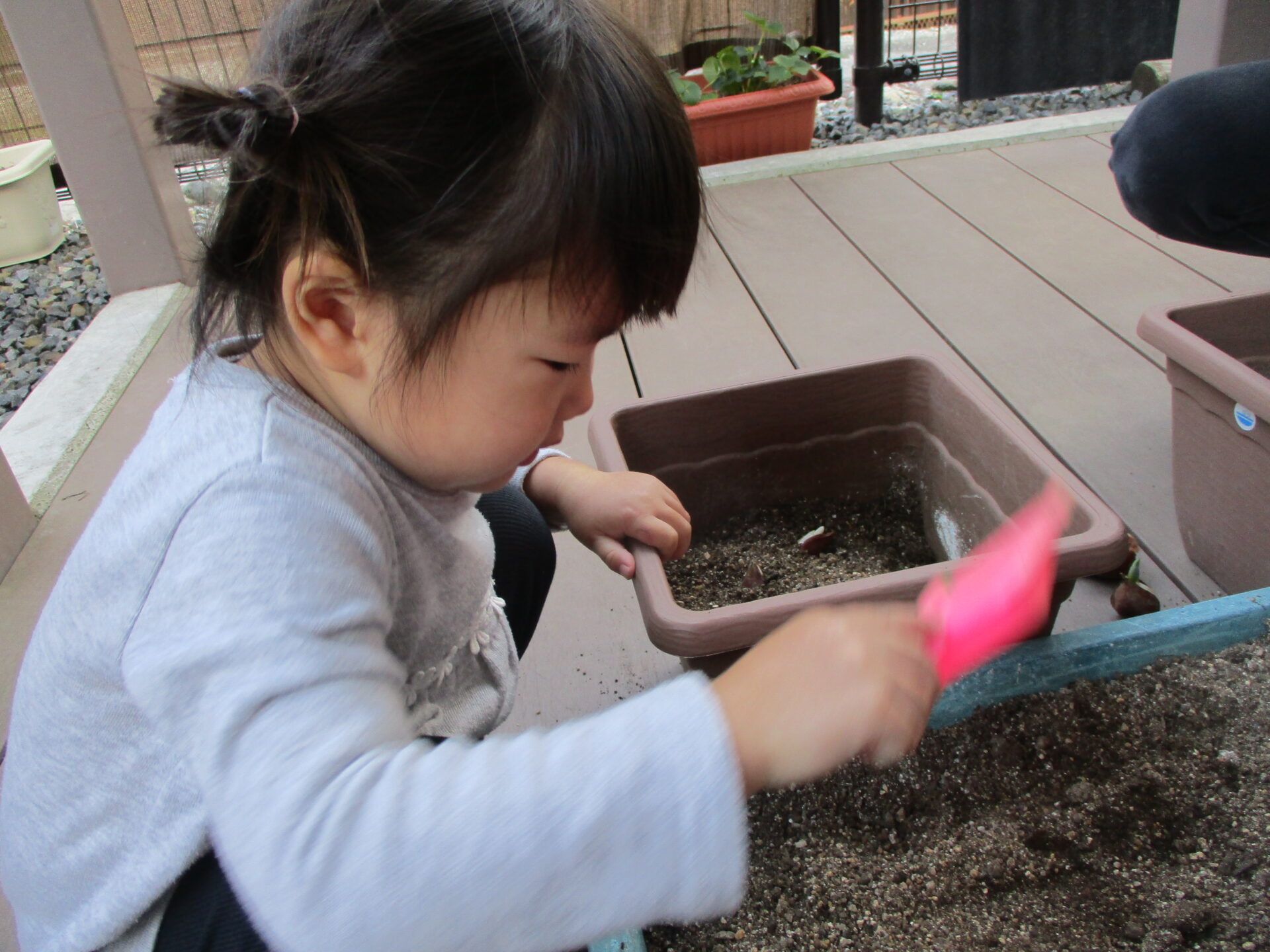 先日、2歳児あめチームは、みんなでチューリップの球根を植えました😊