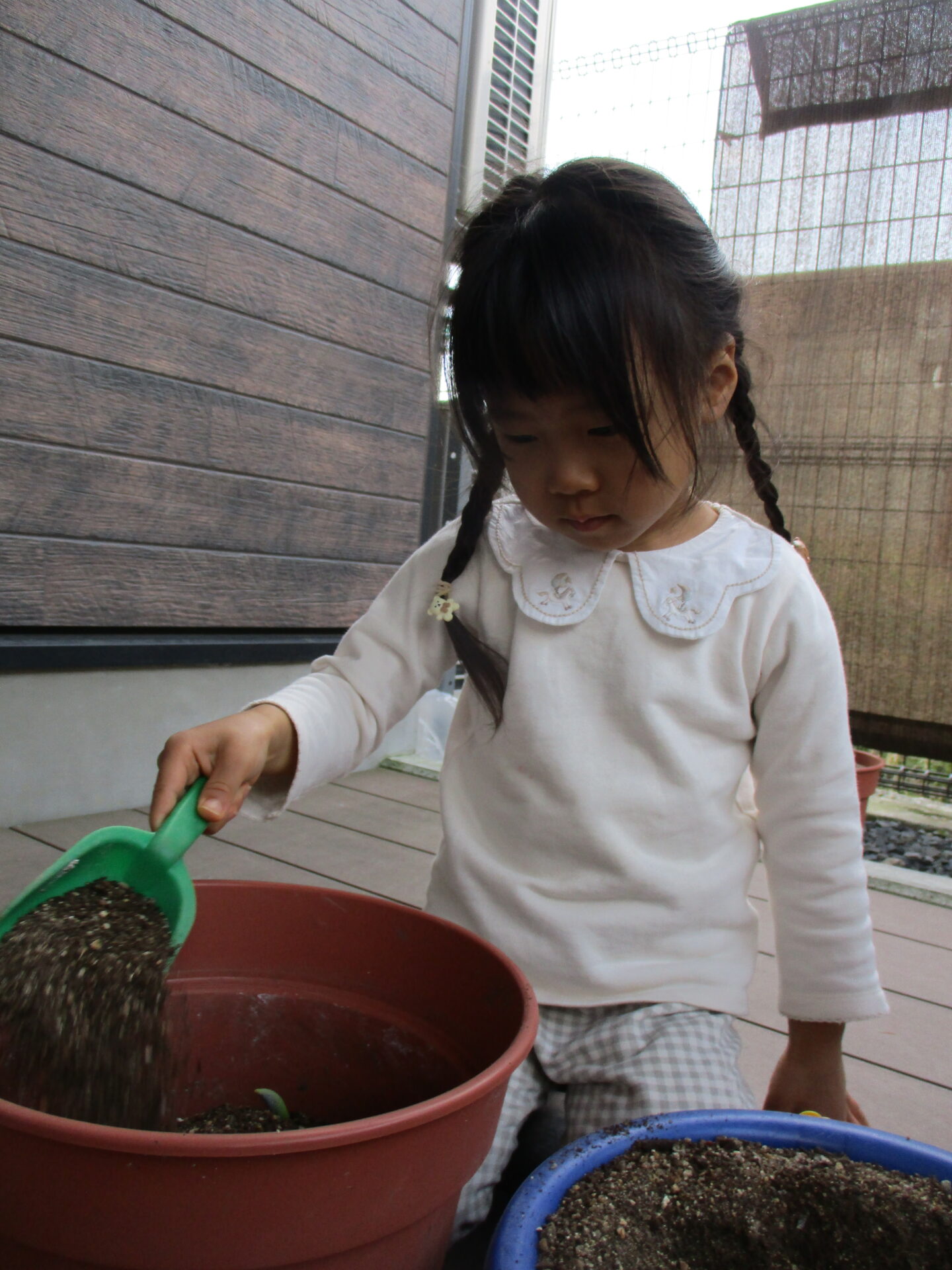 「土をこぼさないようにするんだよね!!」と言いながら頑張ります👌✨