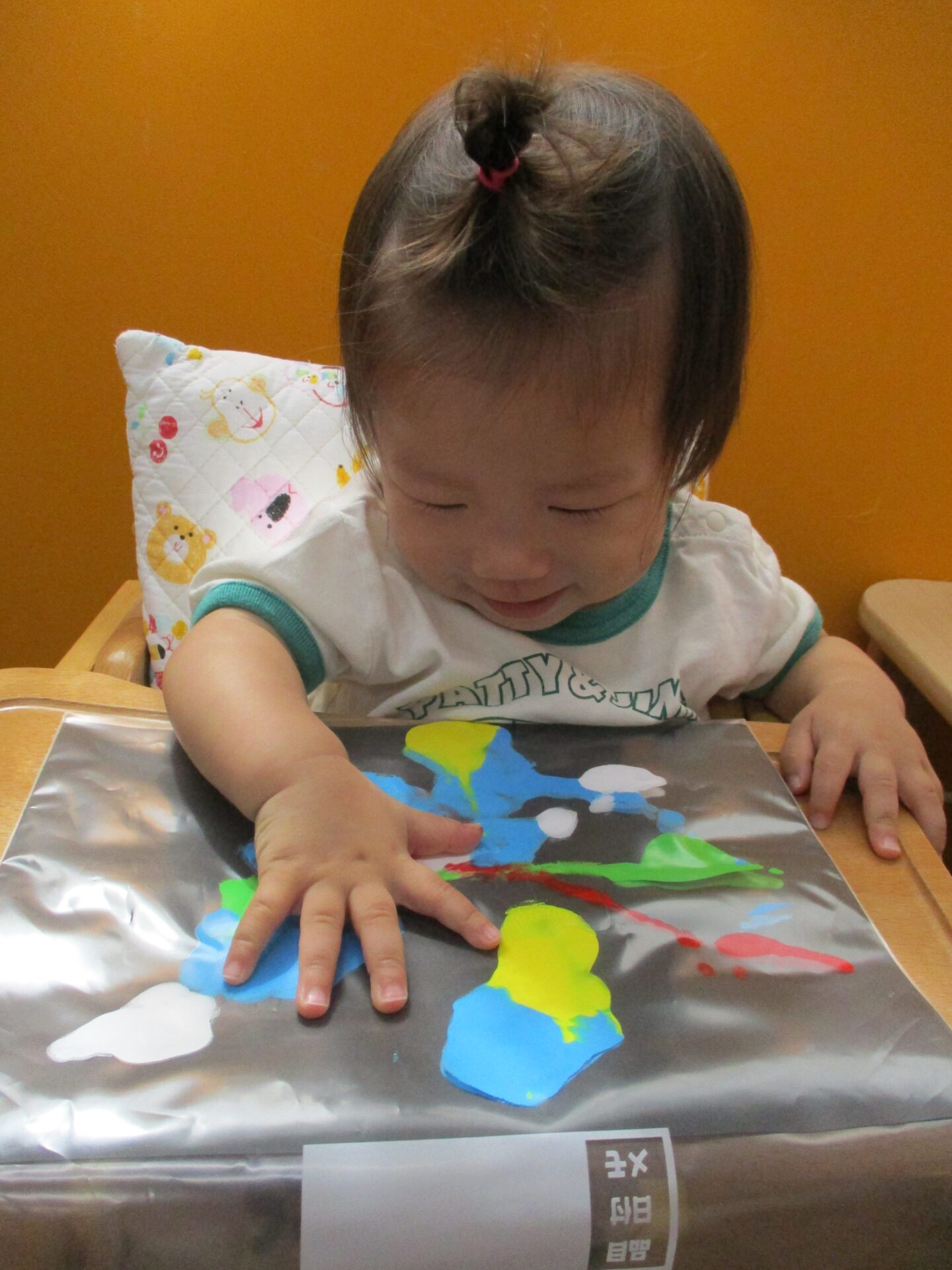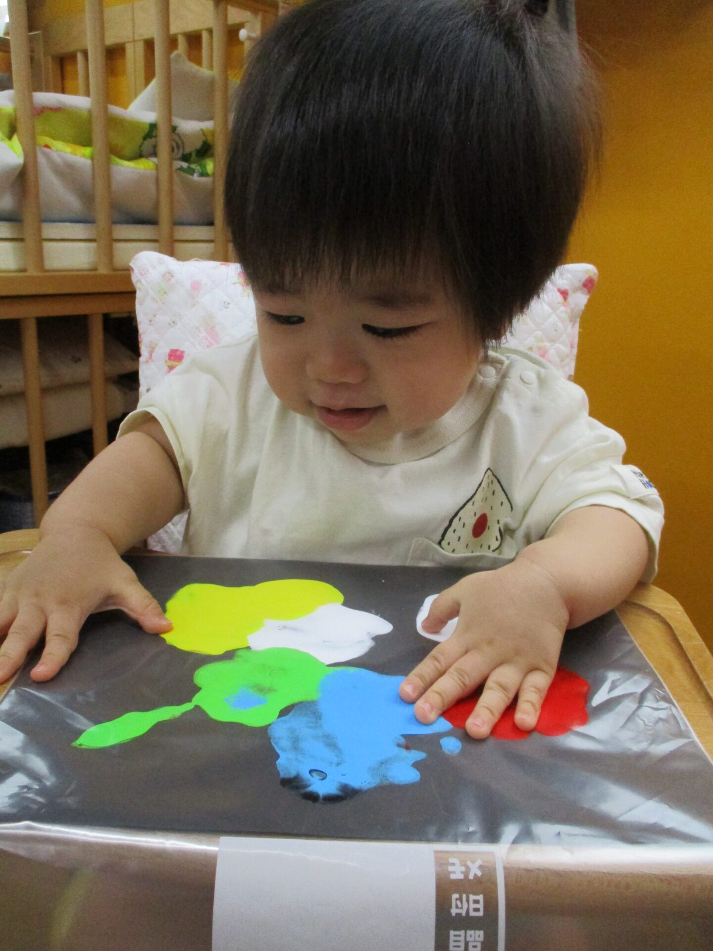 初めて、絵の具を使ったフィンガーペインティングという感触遊びにもチャレンジしてみました🎵