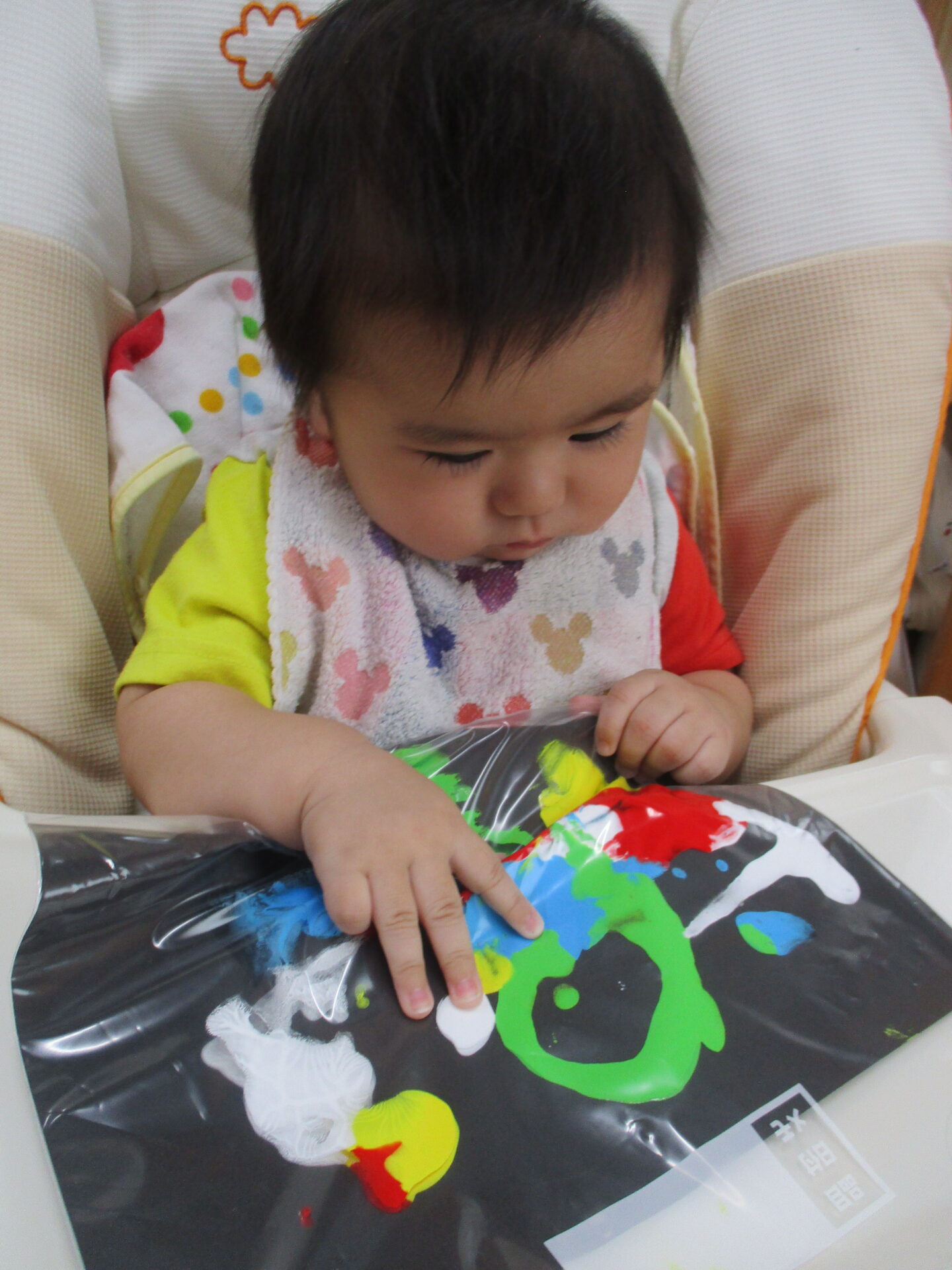 初めての絵の具遊び🎵(0歳児うみチーム)