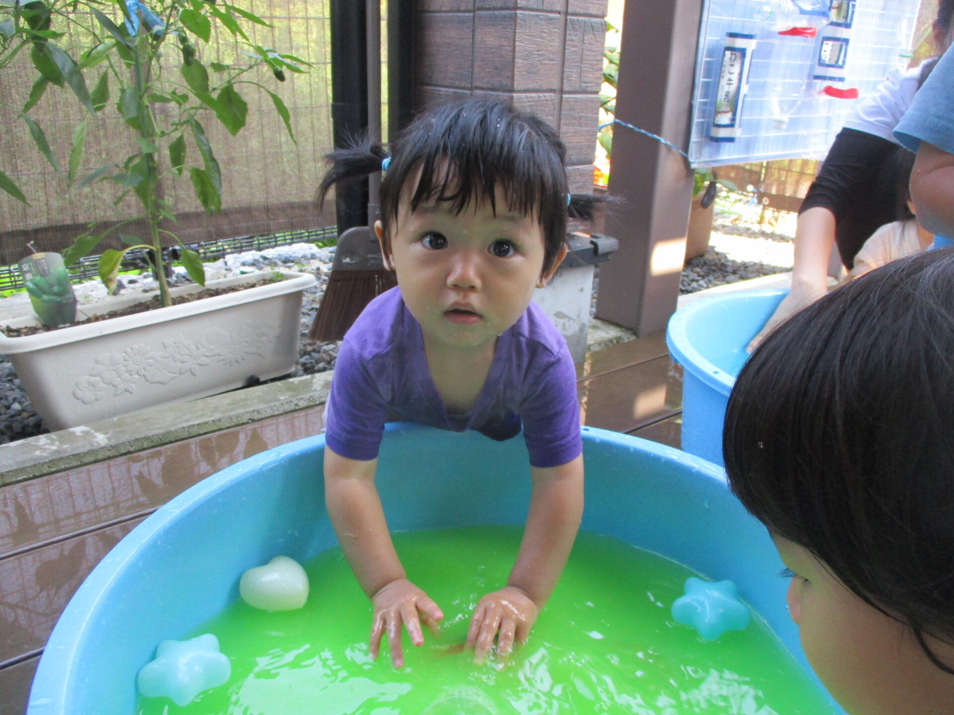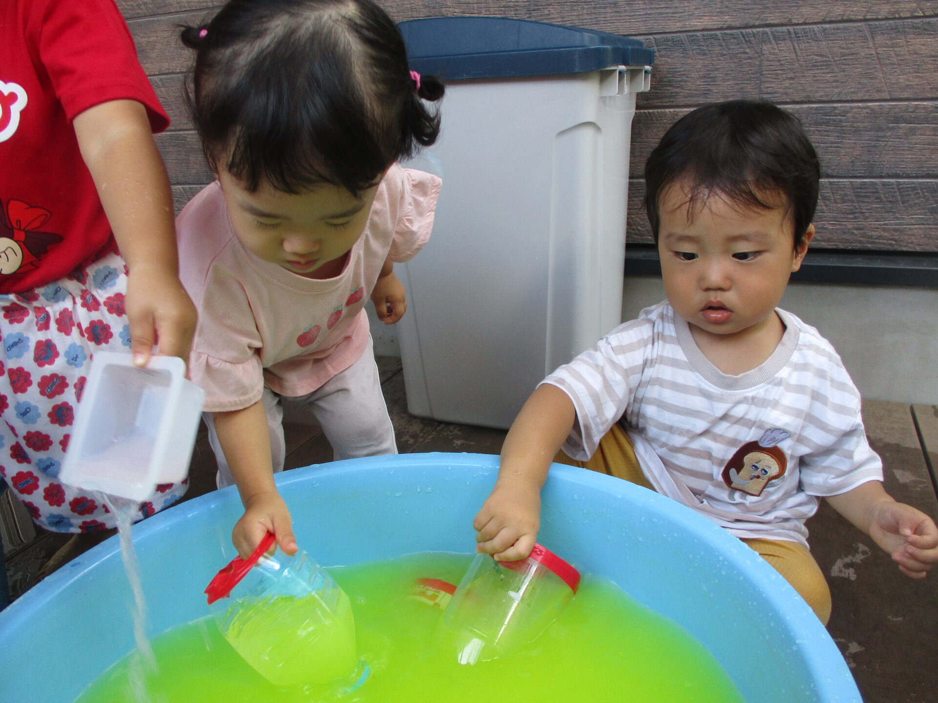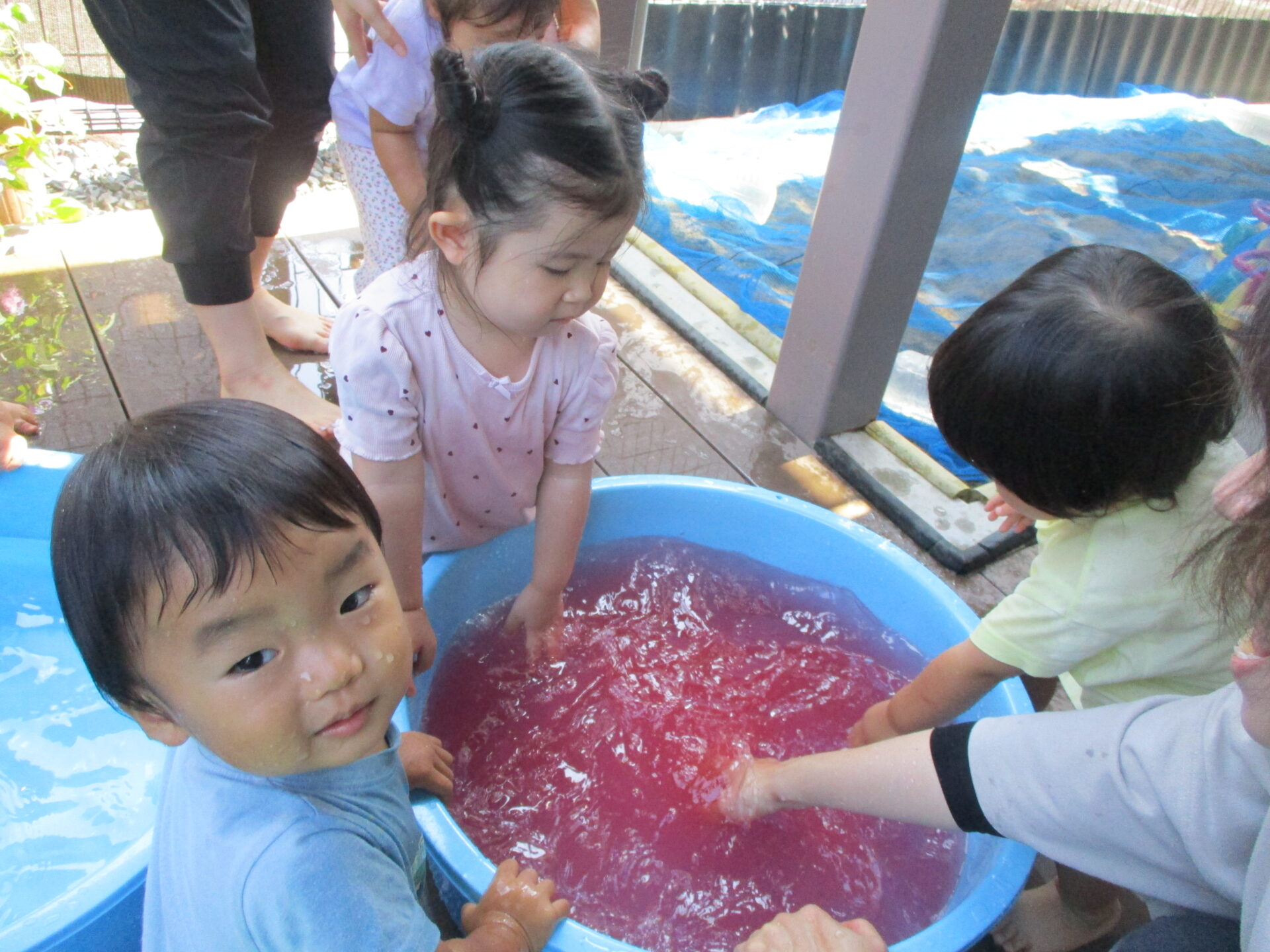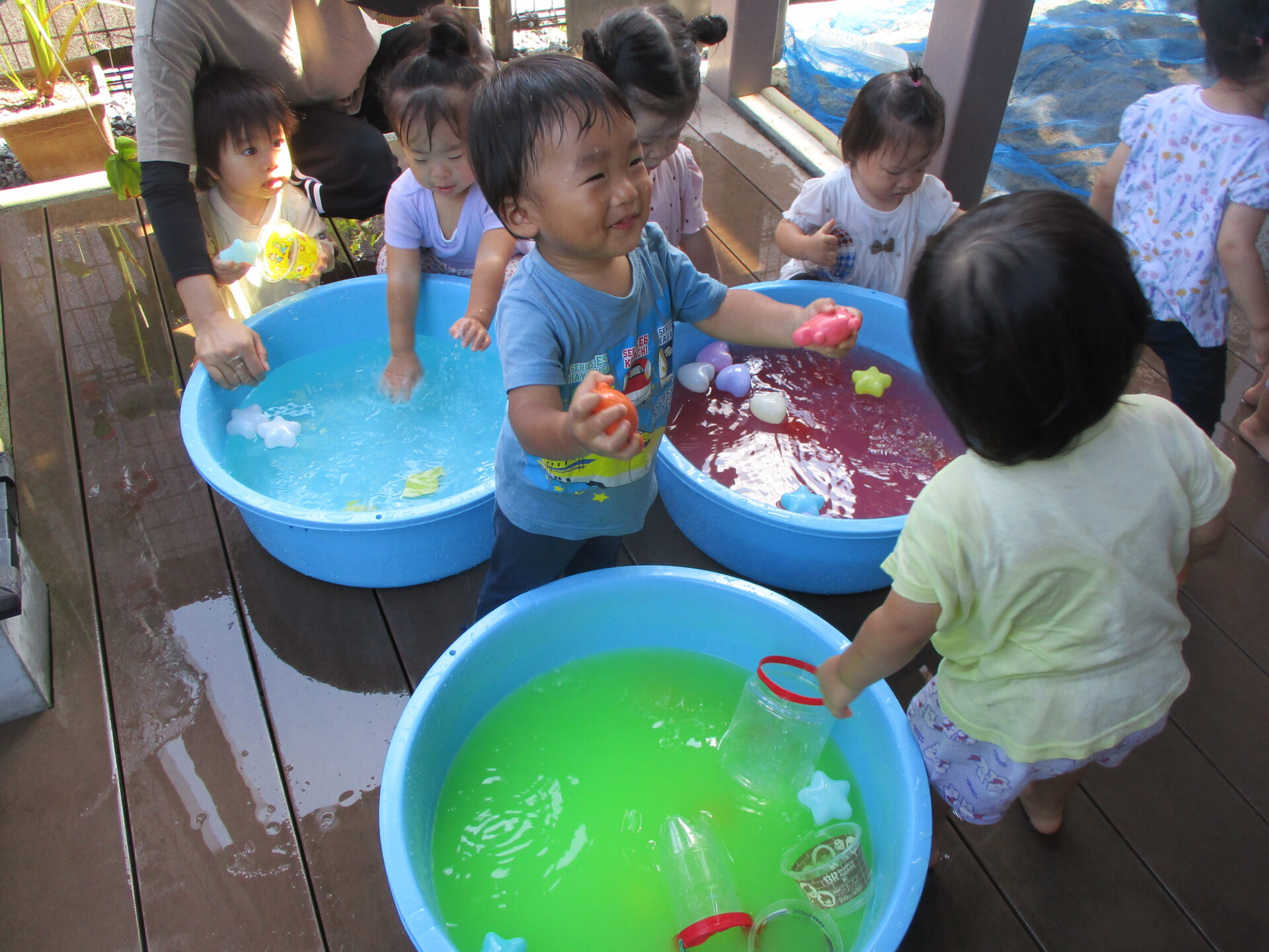 毎日楽しんでいる水あそび(⌒∇⌒)✨今回は、水の中に少しだけ絵の具を入れて、色水あそびをしました(^▽^)/