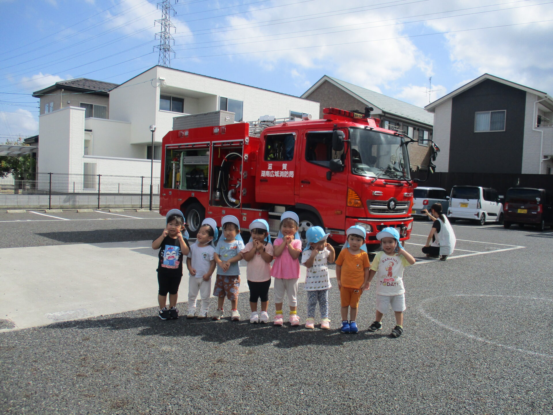 姉妹園の栗東くじら保育園に消防車が来る!!ということで、治田くじら小規模保育園のあめチームさんも消防車見学に参加させてもらいました🚒✨